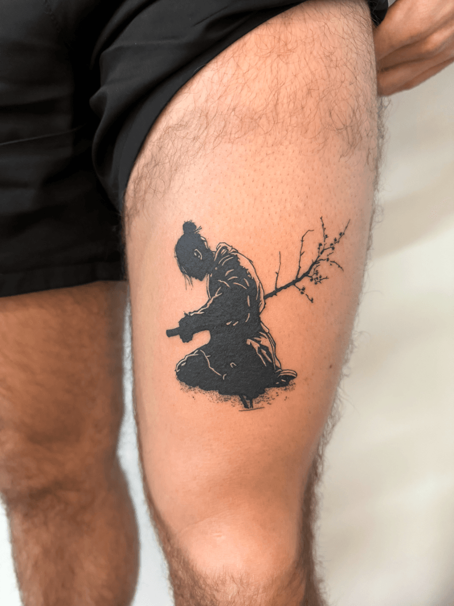 This tattoo features a silhouette of a kneeling samurai figure holding a sword. A branch with leaves extends from the samurai's back, with a focus on strong black lines. The overall feeling is one of stoicism and strength.