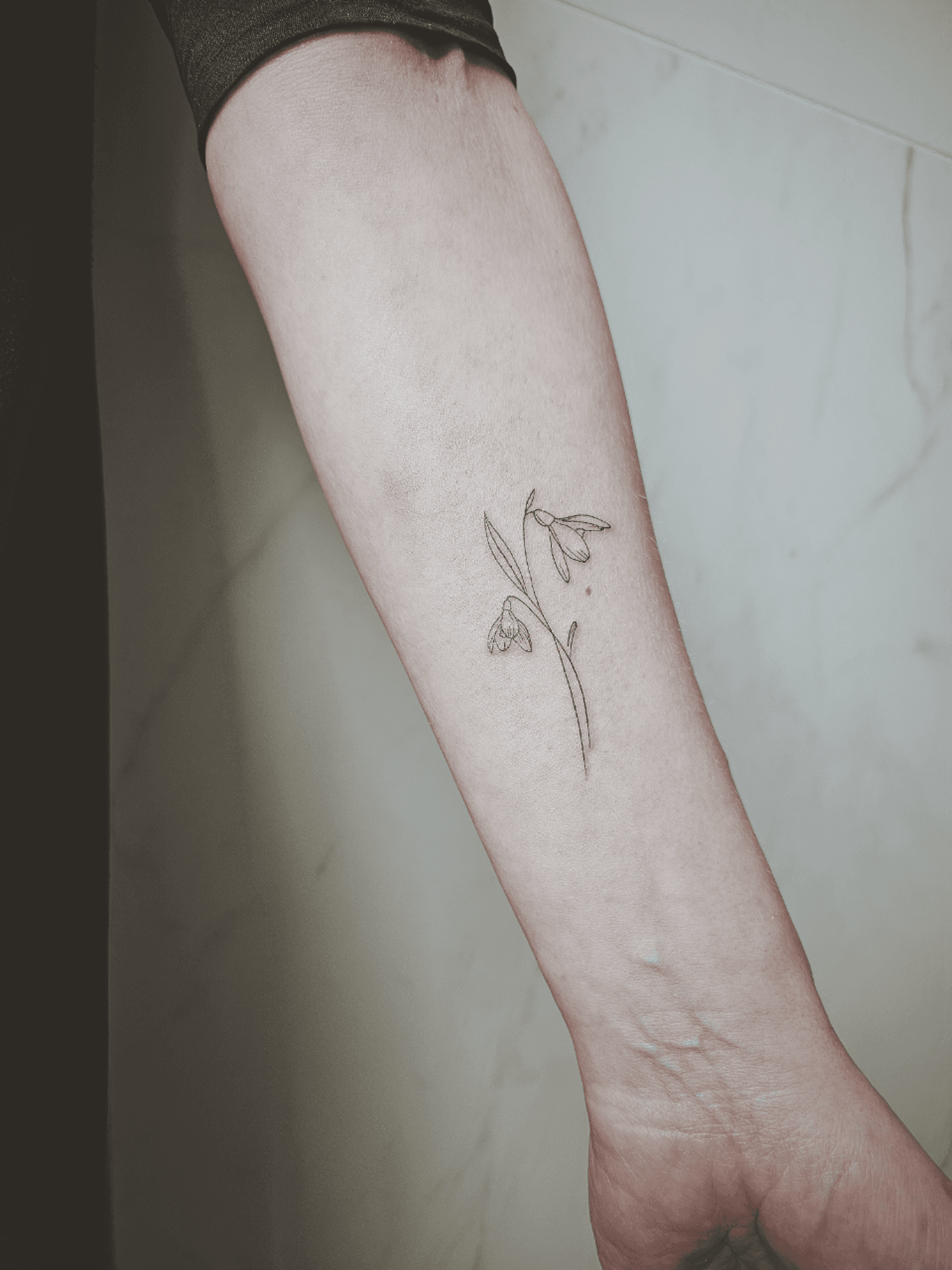 The tattoo depicts a delicate snowdrop flower. The style is minimalistic with fine lines. #fineline