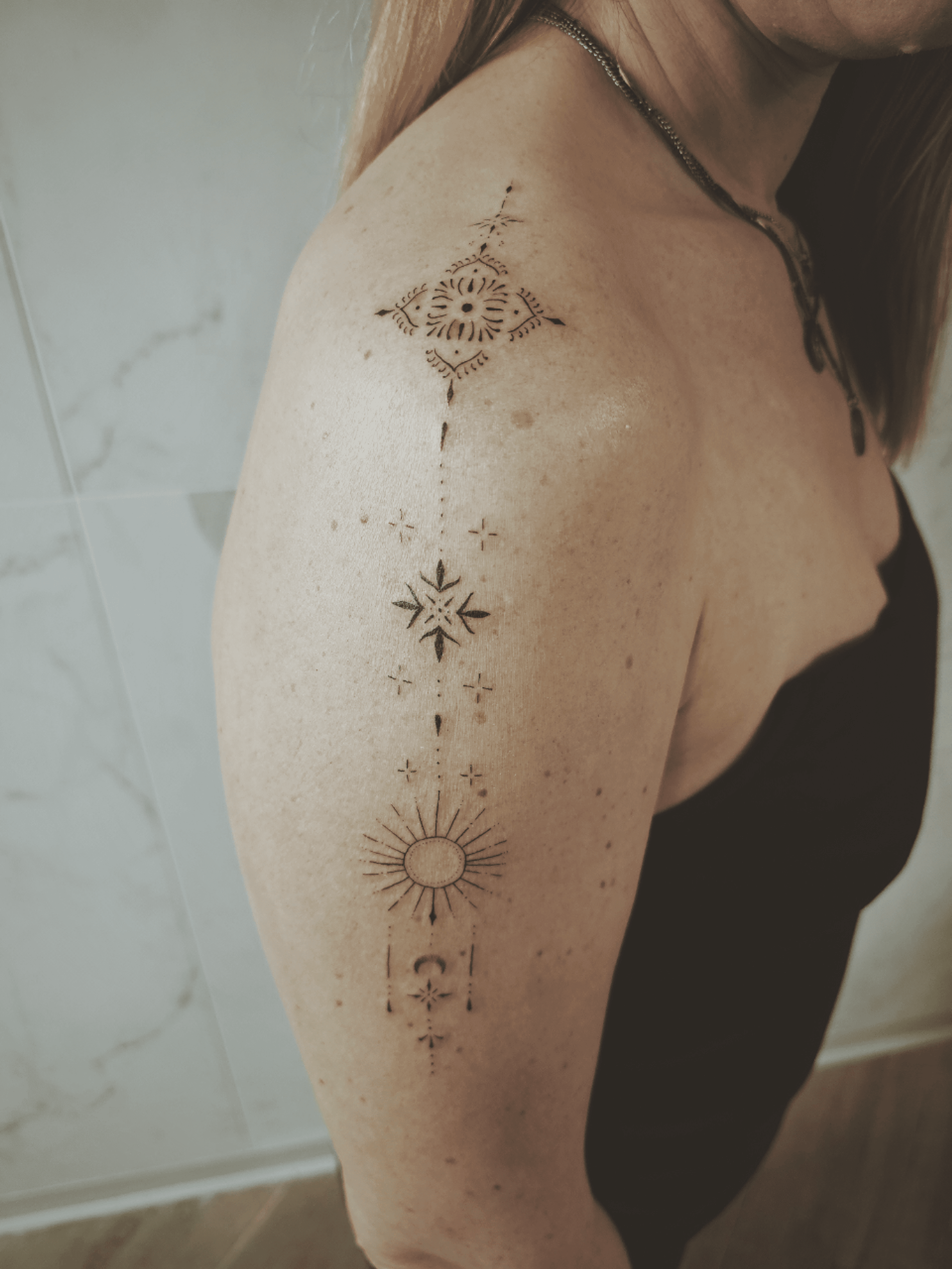 The tattoo is a vertical design featuring various celestial elements like stars, a sun, and a moon, aligned from top to bottom. The style is minimalistic, with fine lines creating an elegant design.