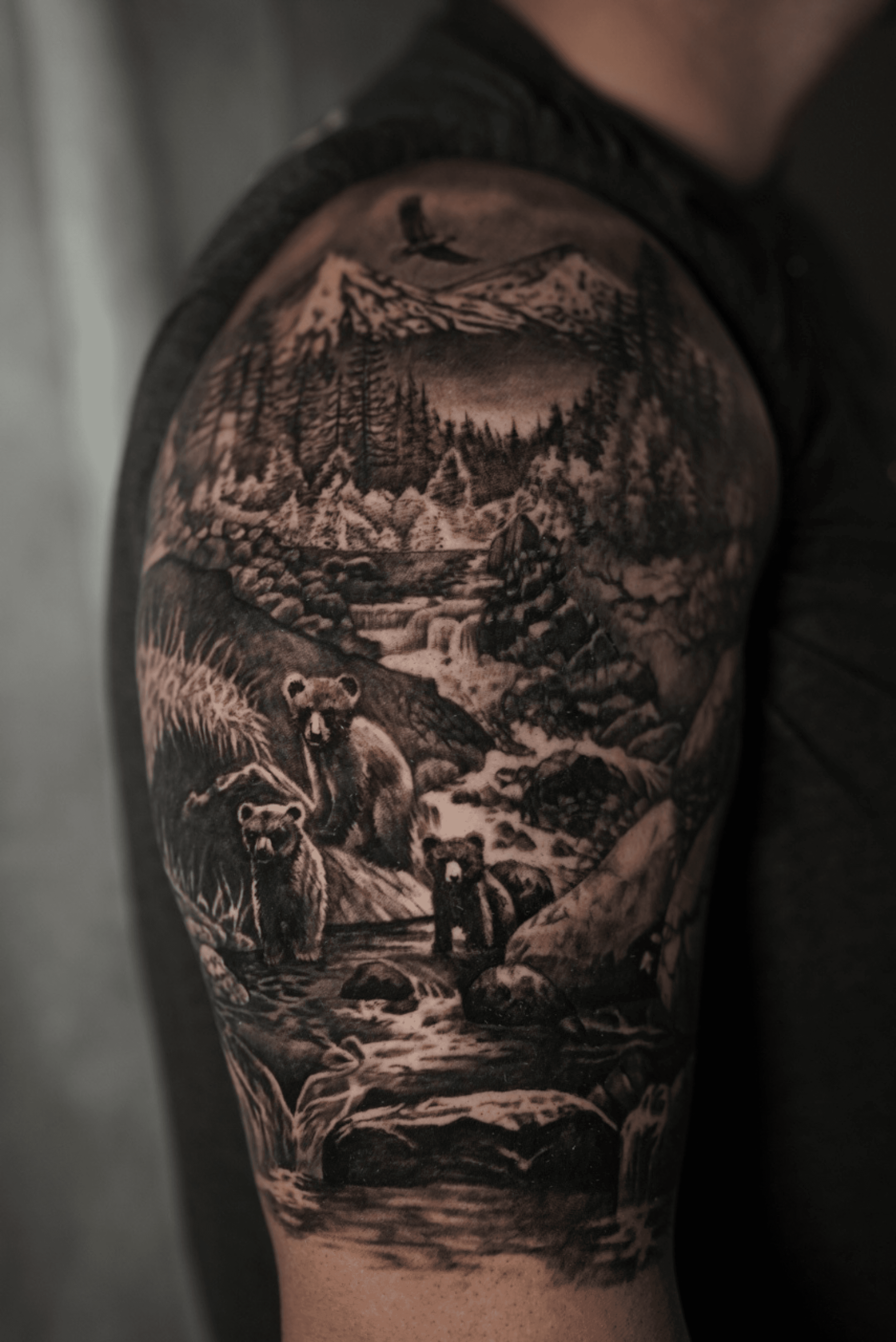This tattoo is a scenic landscape featuring bears and a waterfall. It incorporates bears in a stream and a forest and mountain background. The style combines elements of realism with a detailed, illustrative approach. The tattoo's feel is serene and evokes a sense of nature and wildlife.