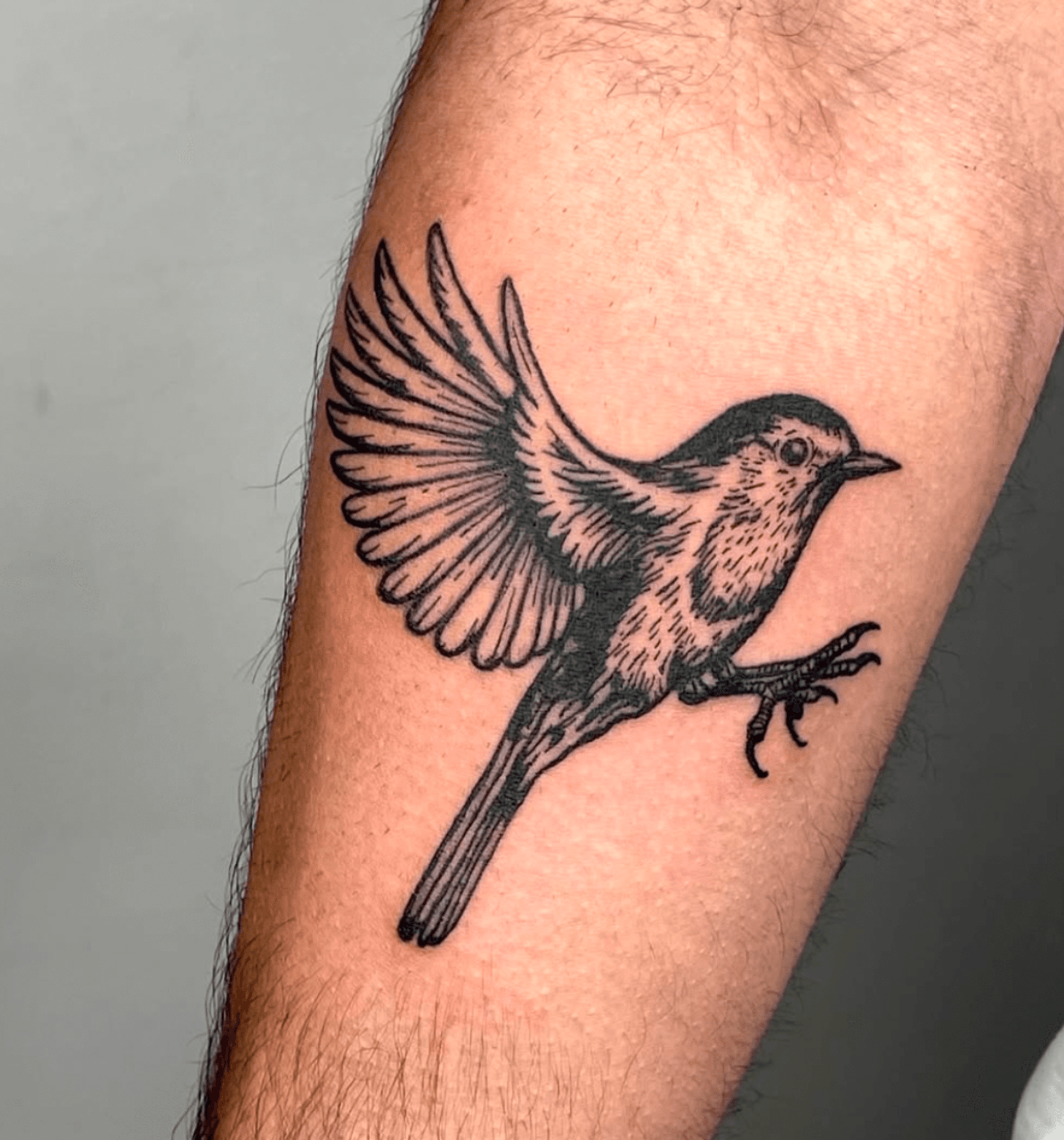 A fine line tattoo of a bird in mid-flight. The illustration emphasizes detailed wings, and the bird is depicted with a delicate, realistic approach.