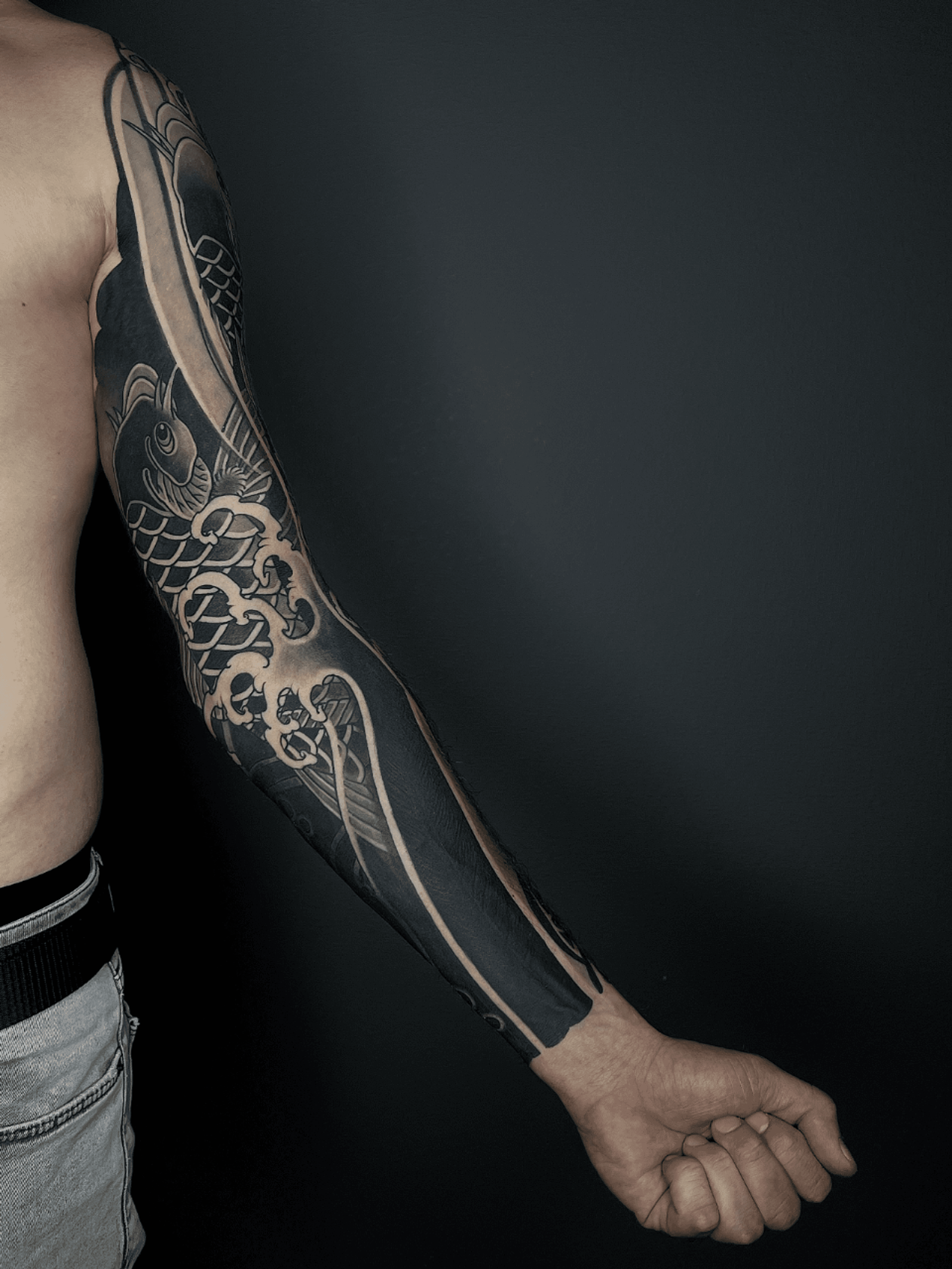 This tattoo design features a full sleeve with a bold style, utilizing a blend of solid black and intricate patterns. The design features a wave pattern and fish. Cover-up