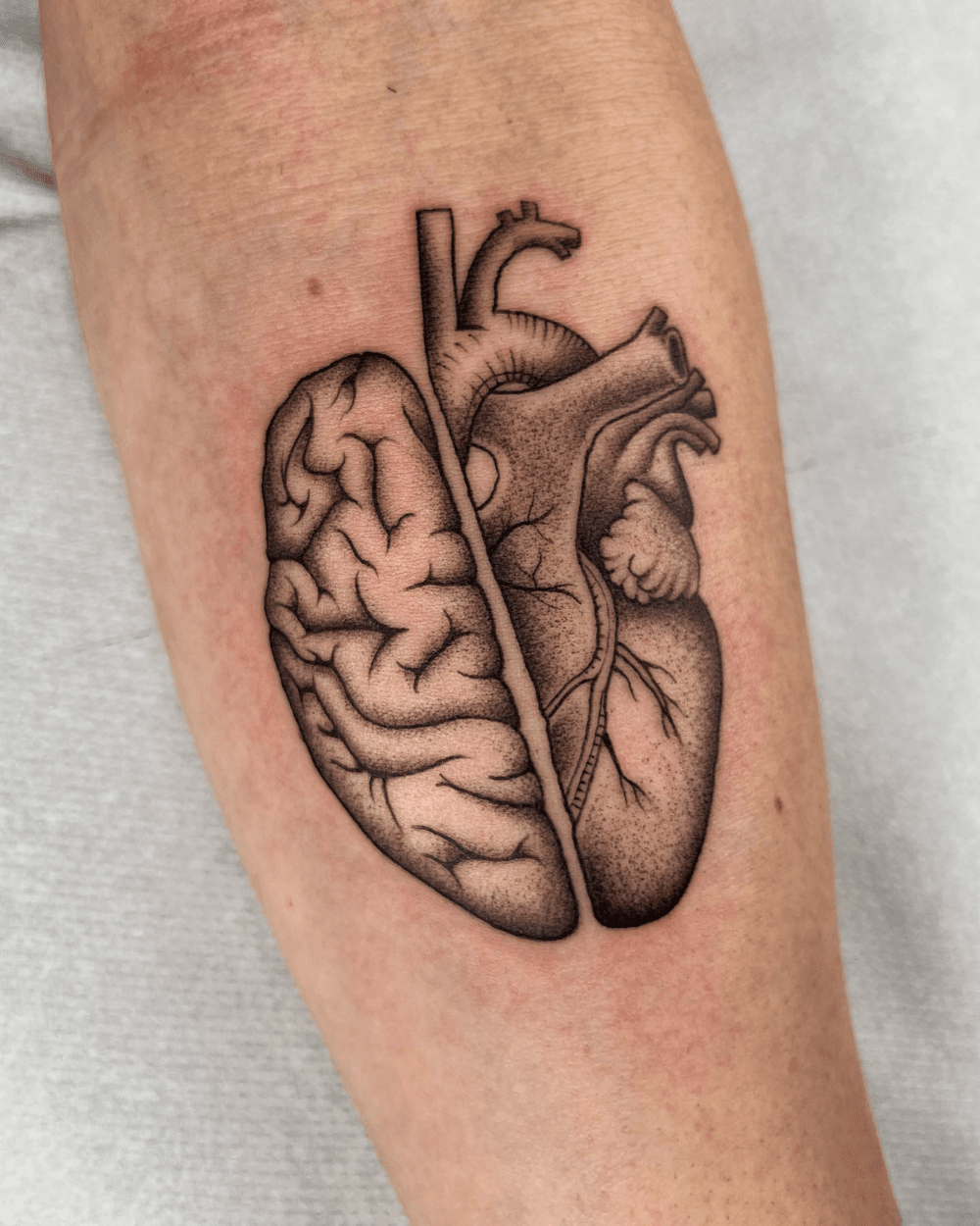 The tattoo depicts half a brain and half a heart. The style uses stippling and fine lines to create detail. It has a thoughtful and anatomical feel.