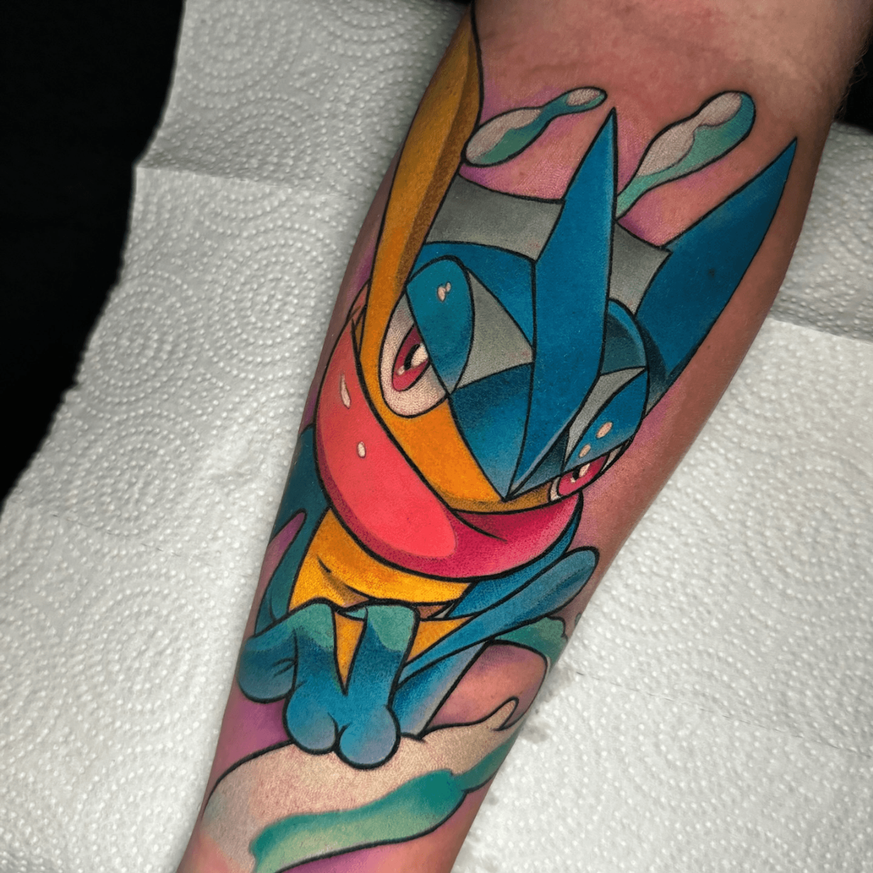 This tattoo showcases Greninja from Pokemon, drawn in a geometric and colorful style. The tattoo uses a palette of bright blues, reds, and yellows, enhancing its dynamic appearance.