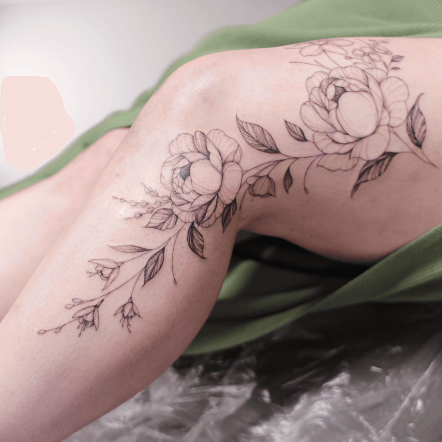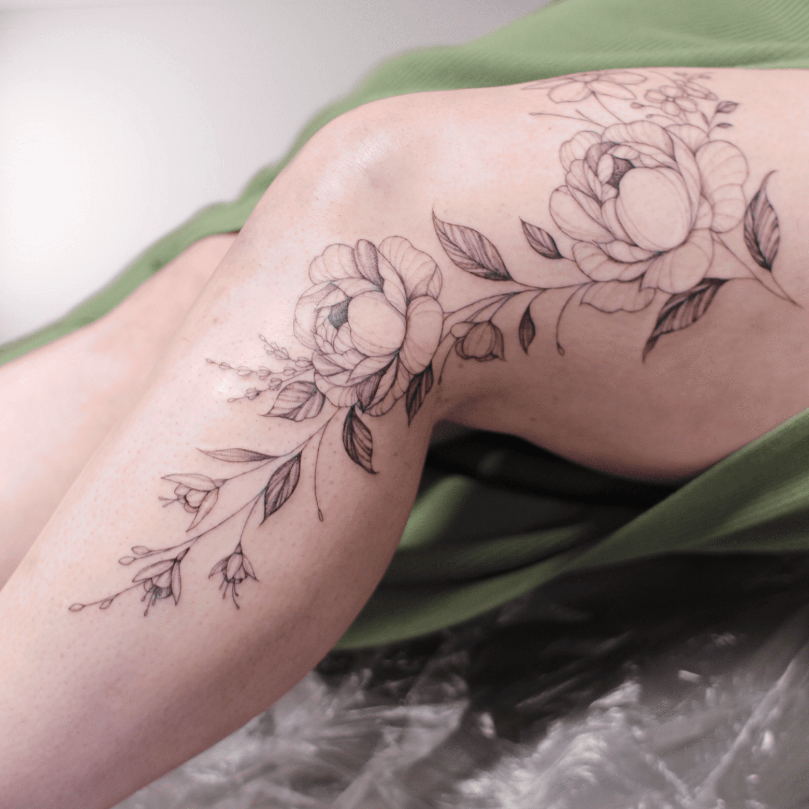 floral vine tattoo of wildflowers wrapping from the thigh and knee down to the lower leg in a delicate feminine fineline style
