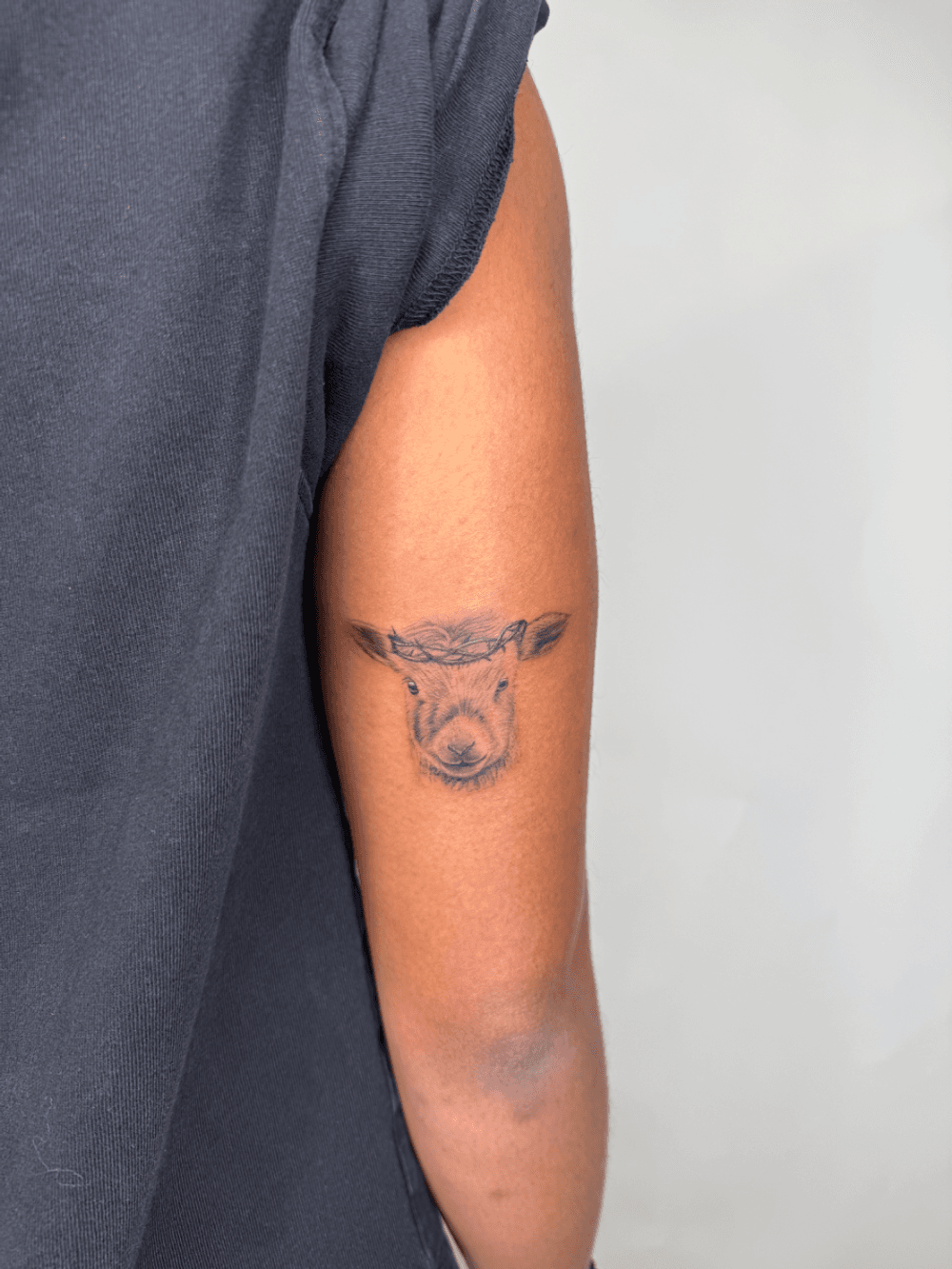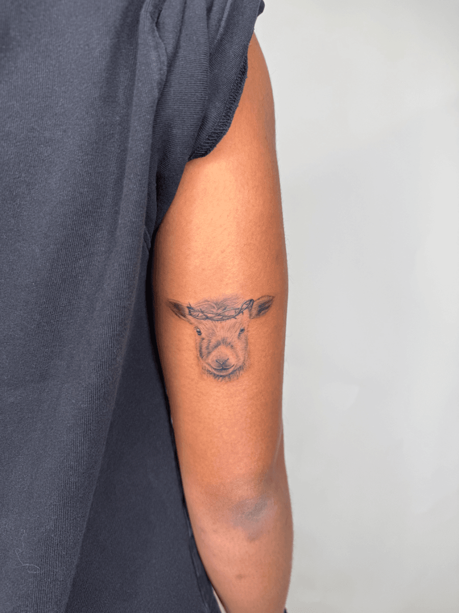 A small, detailed tattoo of a lamb's head with a crown of thorns, rendered in a realistic, shaded style. The design has a soft, delicate feel, suggesting a focus on detail and texture. The technique appears to be fine-line or micro-realistic work, with emphasis on the shadows and nuances of the lamb's features.