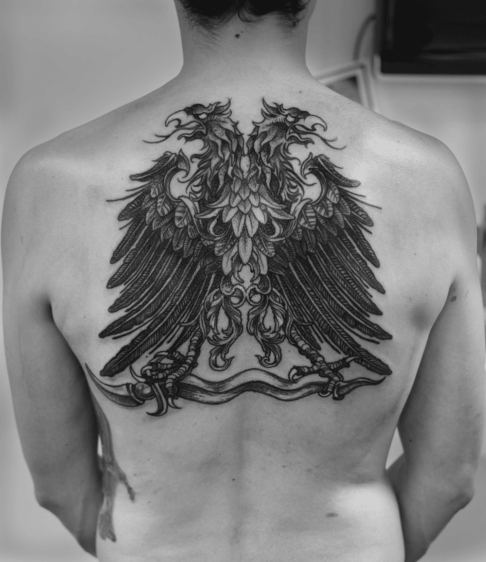 Highly detailed black and grey tattoo of a double-headed eagle with intricate feather patterns and a powerful, regal presence, spanning the upper back. European medieval vibes and engraving style combined with dots and line work. ___________________________________________ #FredericoRabelo #frericorabelotattoo #tattoo #tattooidea #brooklyn #brooklyntattoo #NYtattoo #NYCtattoo #besttattooartist #besttattooartistinbrooklyn #besttattooartistNYC #Eagle #Eagletattoo
