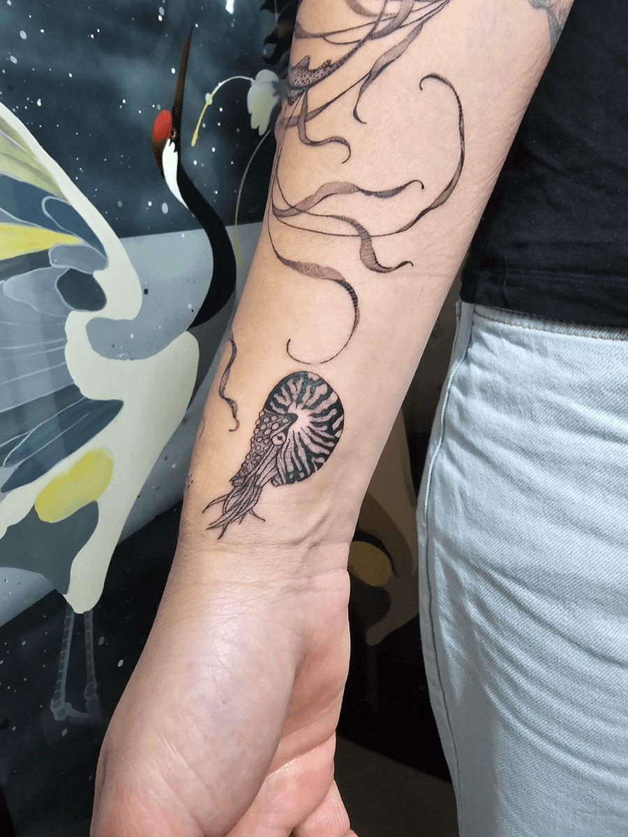 A delicate black and gray fine line tattoo featuring a detailed nautilus shell with tentacles, accompanied by swirling, organic lines extending up the forearm, creating an aquatic and flowing aesthetic.