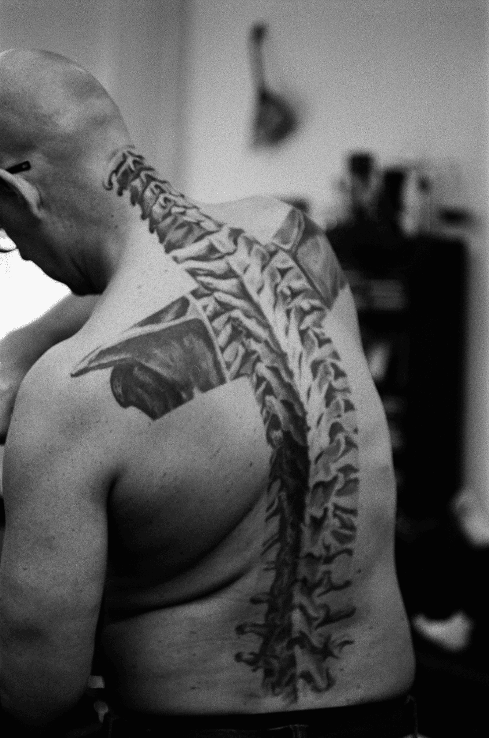 A large black and gray tattoo extending from the neck down the spine, depicting a detailed, almost grotesque, skeletal or biomechanical spinal column. The design emphasizes texture and a dark, gritty aesthetic, appearing as if the spine is exposed or augmented.