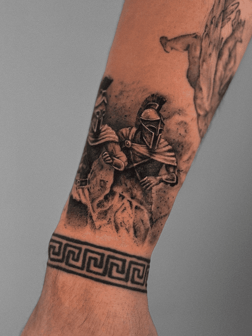 This black and gray arm tattoo prominently features two armored Spartan warriors in action, depicted with realistic shading and detail that gives a textured appearance. The tattoo combines historical motifs with an imposing visual presence. (Band tattoo not by Mitchel)