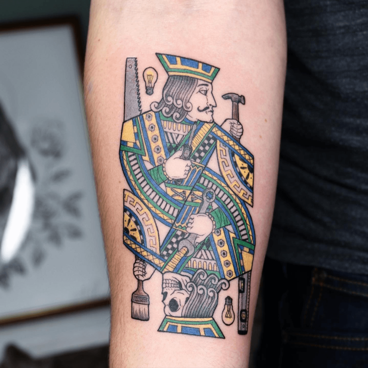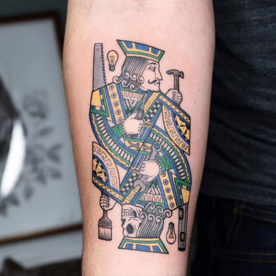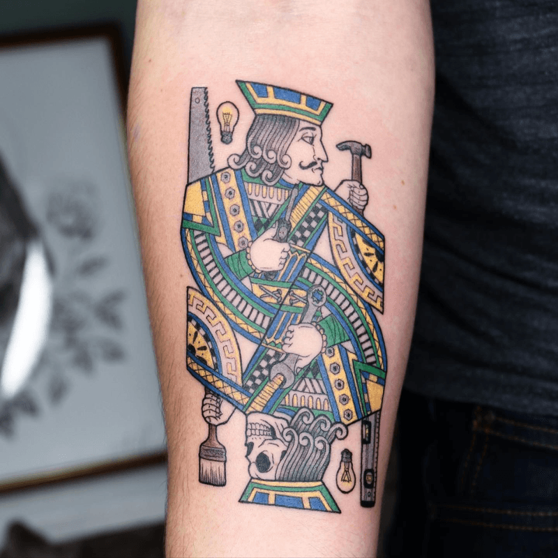 The Jack Of All Trades! A unique playing card-style tattoo depicting a king figure designed as a craftsman, holding tools like a hammer and saw. The image is mirrored and uses vibrant colors with distinct outlines, giving it a playful, illustrative feel.