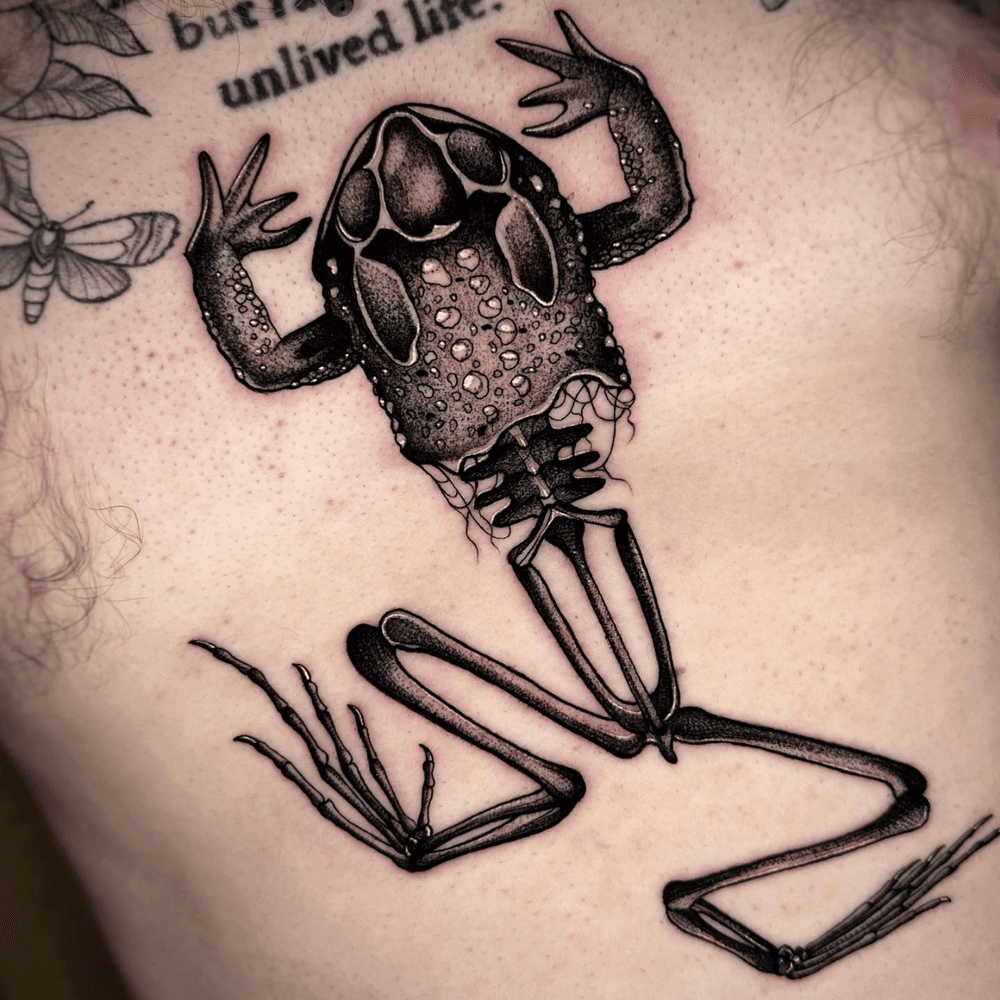 A detailed tattoo depicting a frog's skeleton, with the head partially covered in skin and textured with dotwork, creating a macabre yet intricate anatomical study.