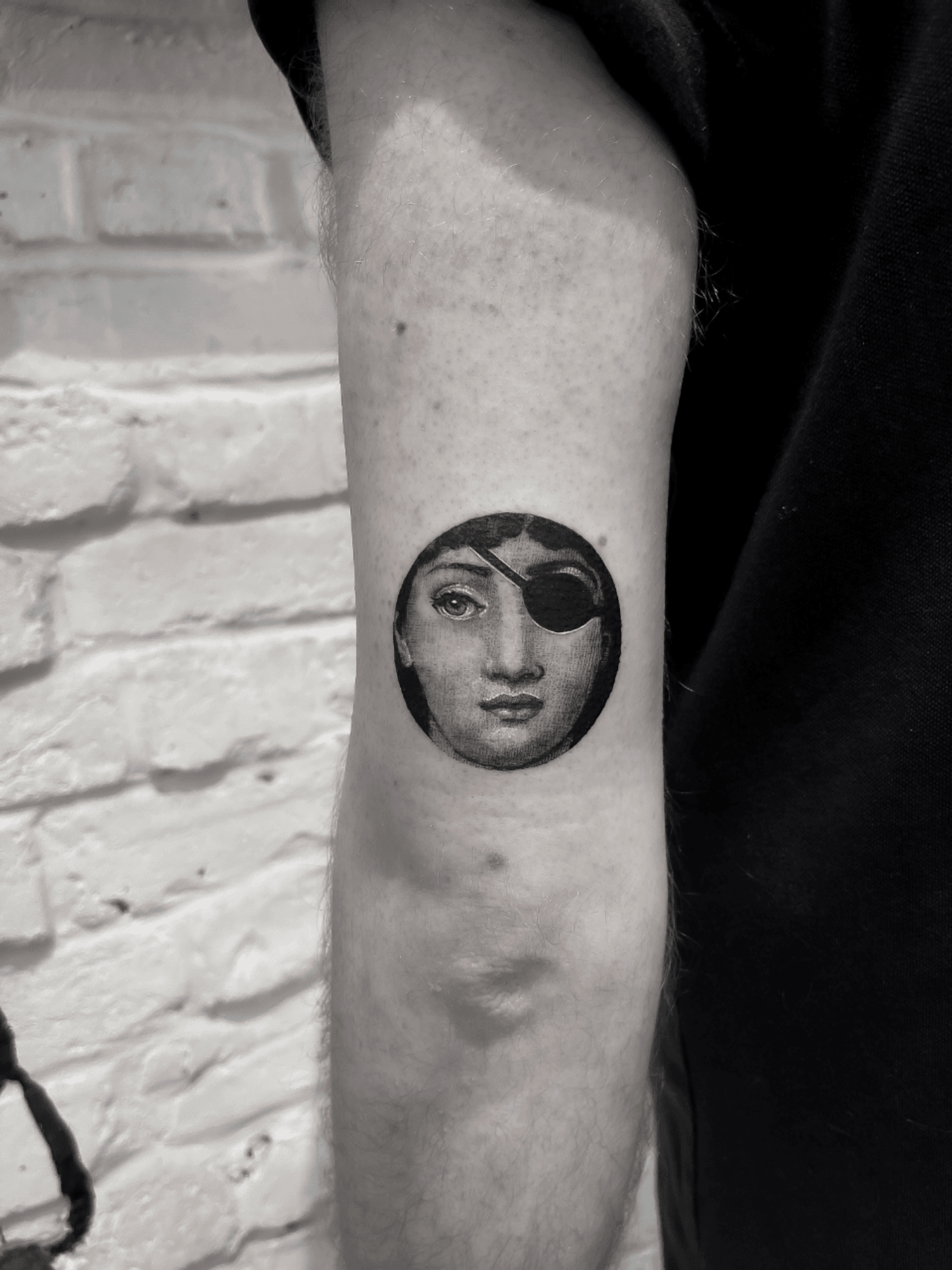 A black and gray micro-realism tattoo of a woman's face with an eye patch, rendered in a classical art style within a circular frame.