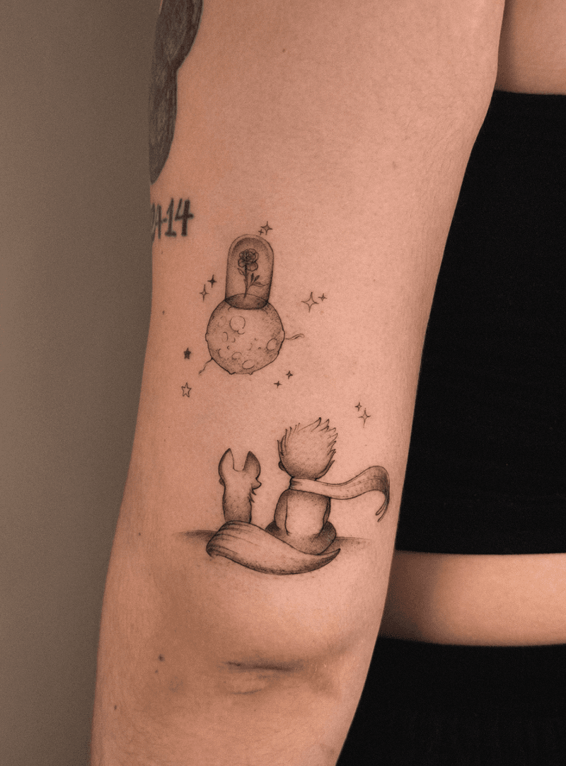 A black and grey tattoo depicting the Little Prince and his fox sitting together, with the rose under a glass dome on a small planet above them, surrounded by stars. The design has a delicate, illustrative, and whimsical feel.