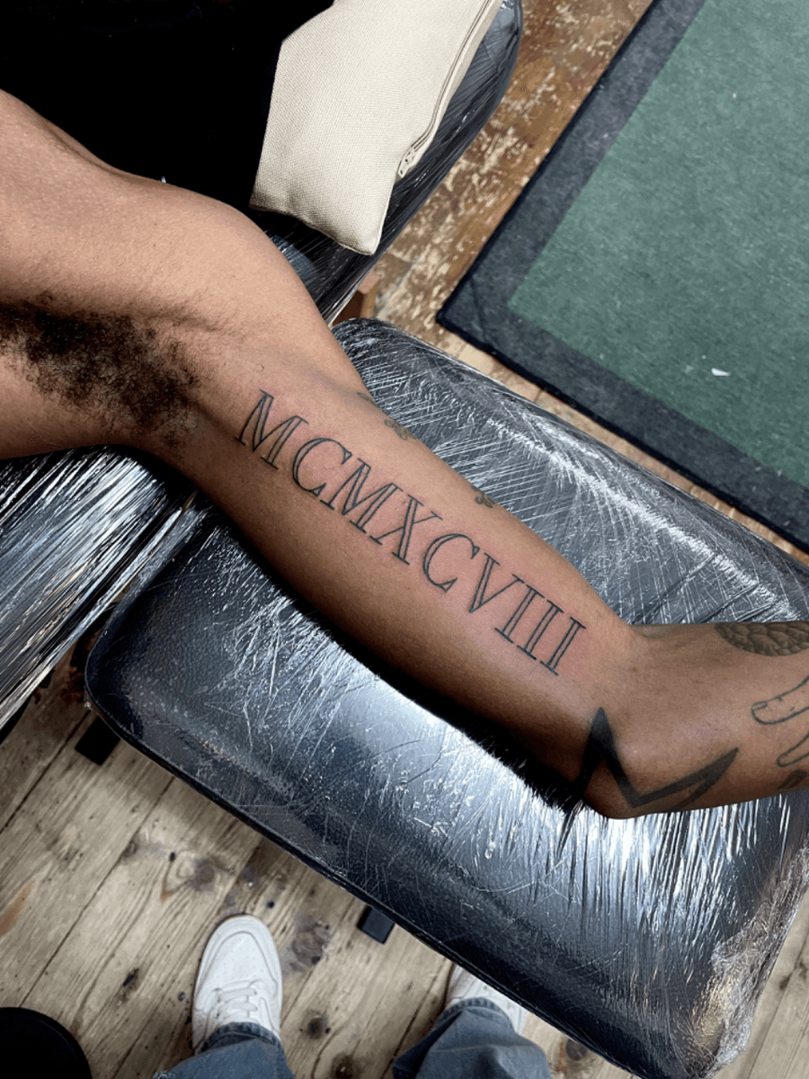 A black line art tattoo features the Roman numerals "MCMXCVIII" prominently displayed along the inside arm, indicating the year 1998 in a classic, clean font.