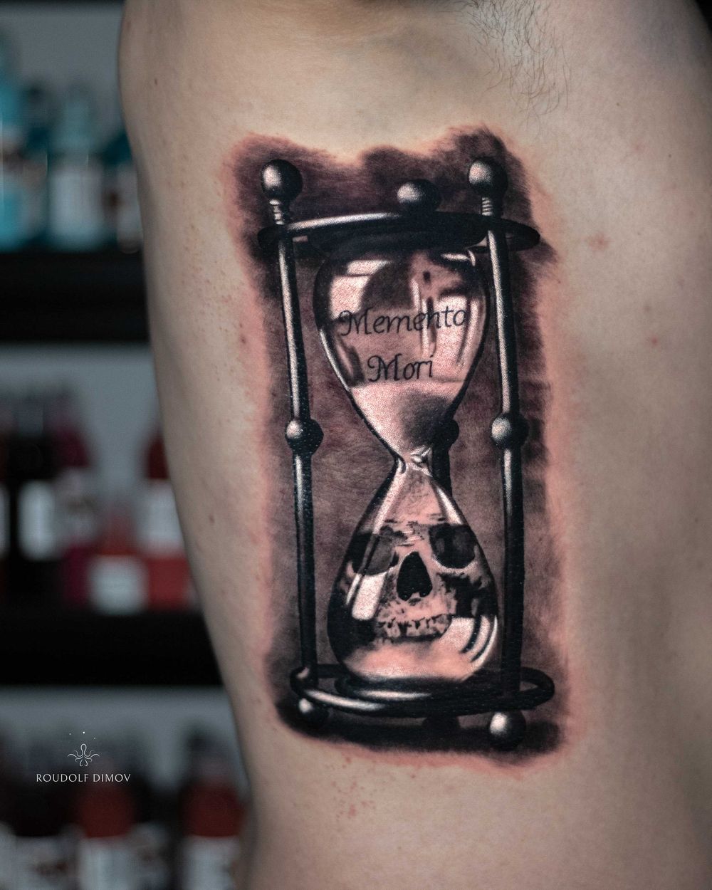 A realistic black and grey tattoo symbolizing the passage of time and mortality. Featuring an hourglass with a skull reflection and the Latin phrase Memento Mori, reminding us to live meaningfully. Tattoo by London artist Roudolf Dimov.