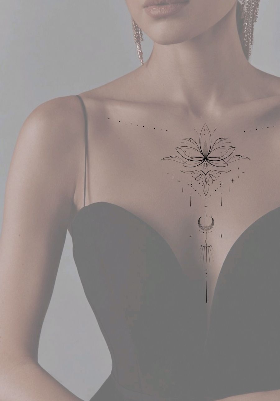 Fine Line Lotus and Crescent Moon Chest Tattoo Design