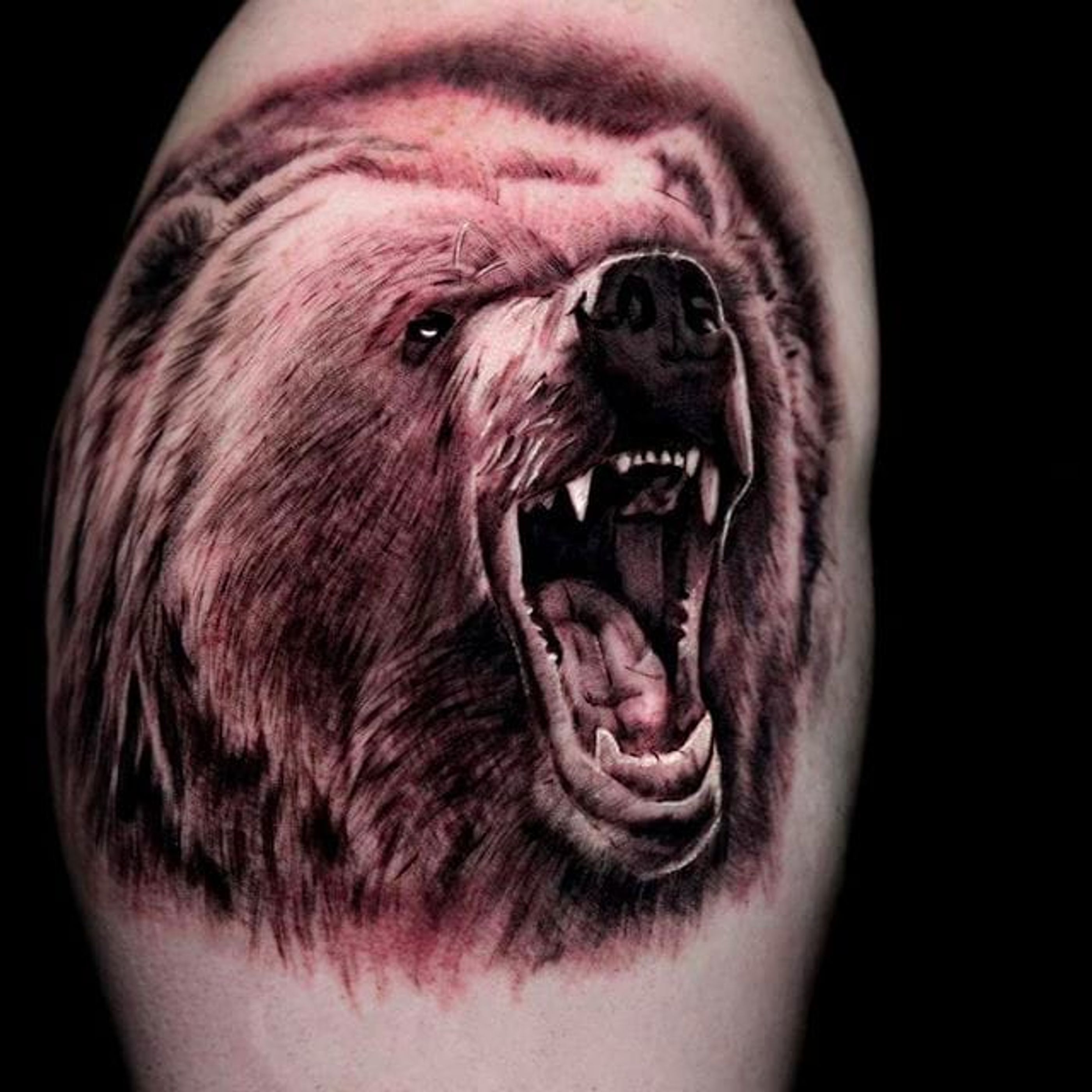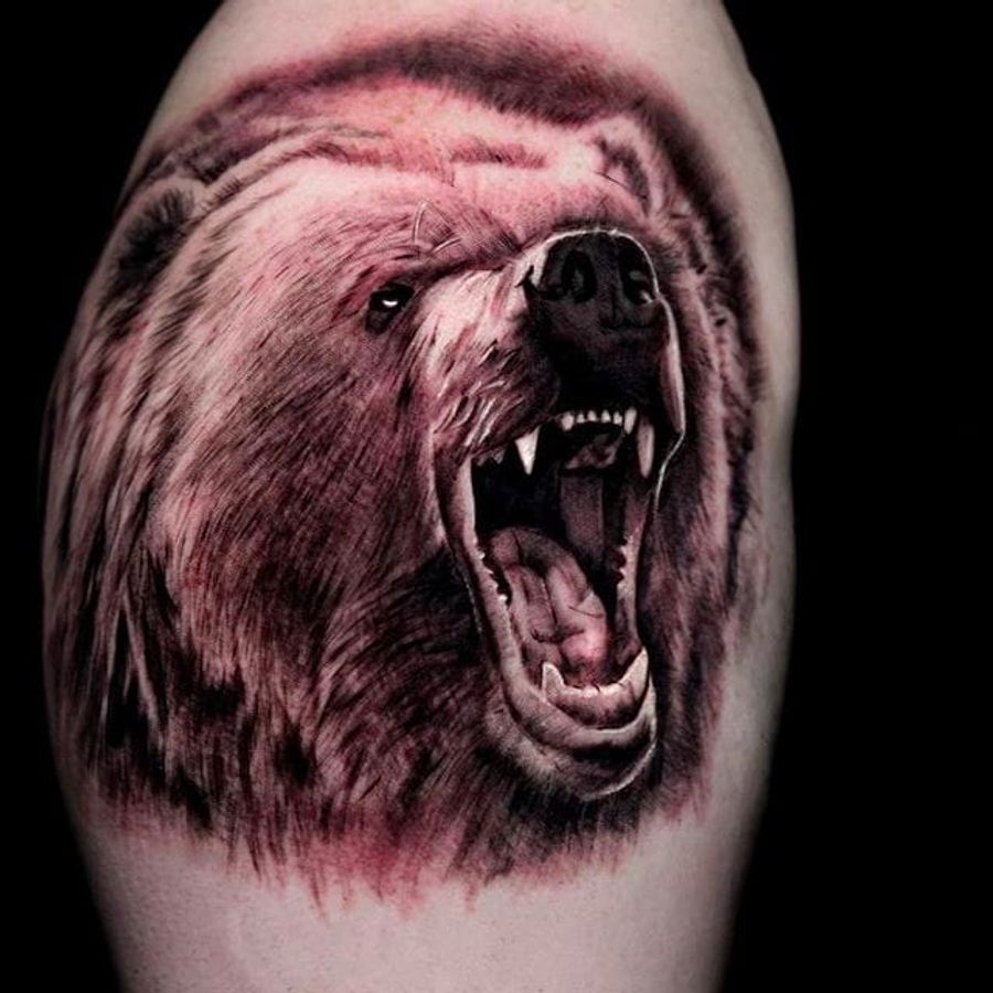 Rad growling bear tattoo done by Shine. #ShinhyeKim #Shine #blackandgrey #fineline #animaltattoo #bear #realistic #realism