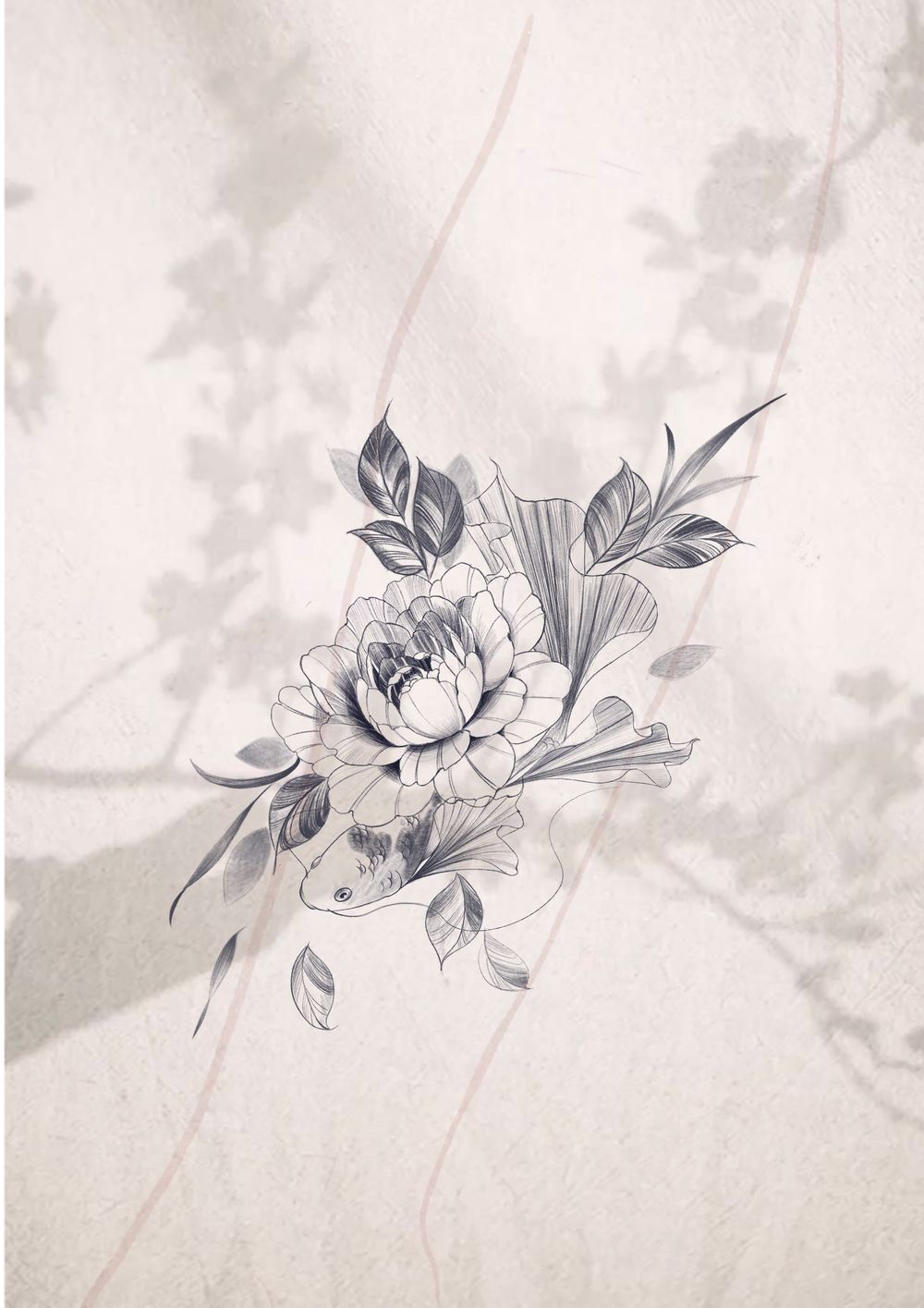 A delicate koi fish and peony flower design. Can be adapted to many parts of the body.