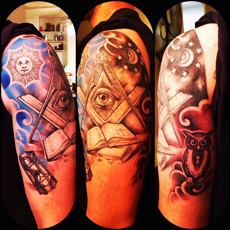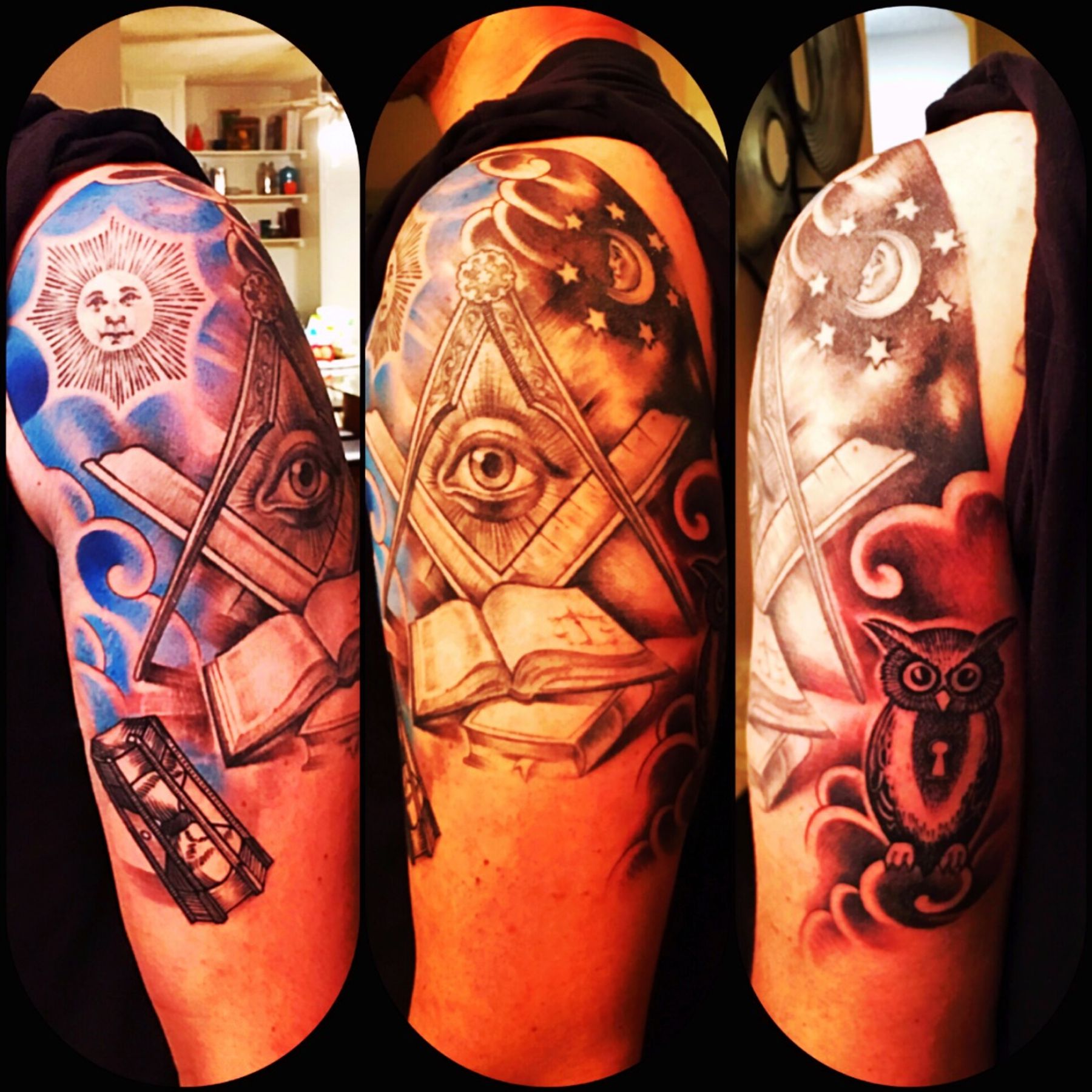 #Freemason #Masonic #Mason #tattoo 1/3 sleeve. Artist Konstantin Nossachev #Noskos (#LosAngeles) #sun #moon #owl #hourglass #book #balance #nightandday