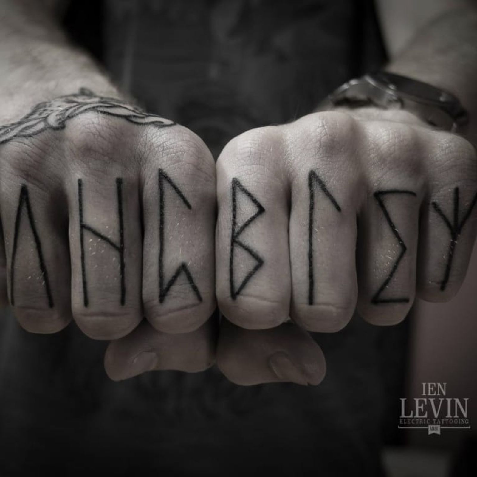 Runes Knuckle Tattoos by Ien Levin #IenLevin #Runes #Knuckles #KnuckleTattoos #HandTattoos #Traditional #Black #Lettering #Script