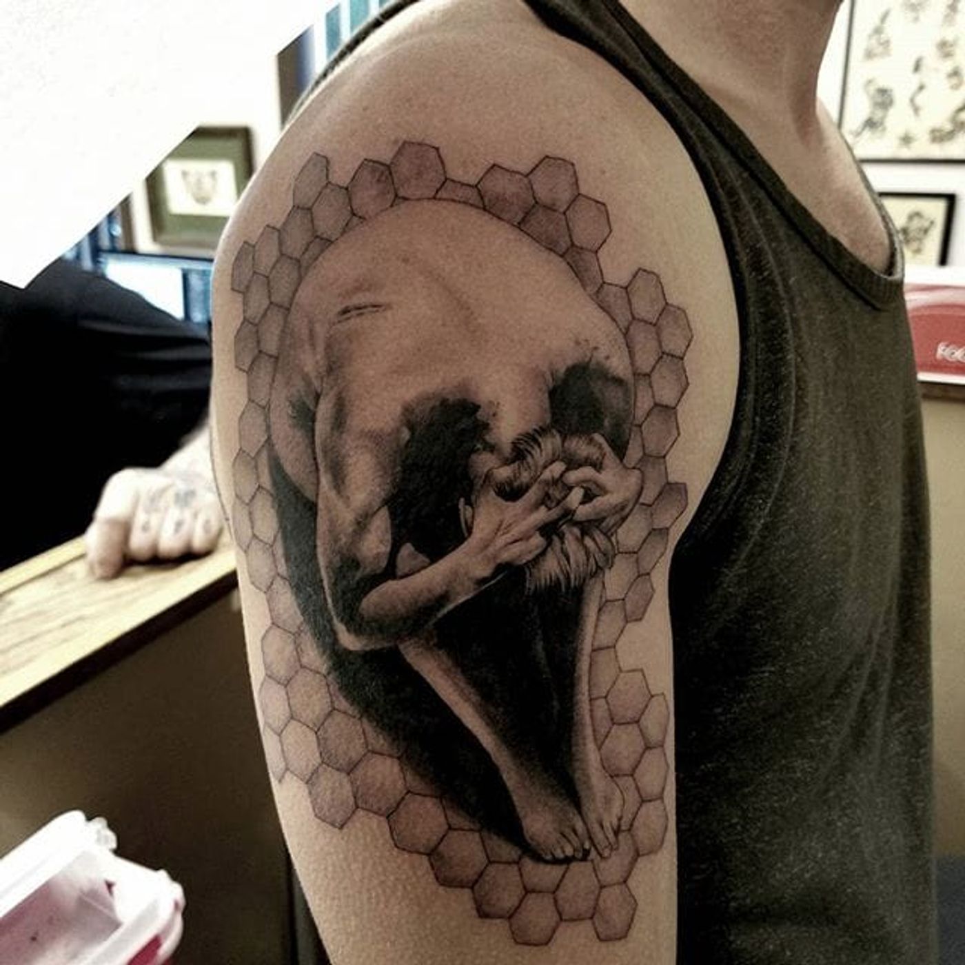 Freddy Negrete's (Instagram @freddy_negrete) black and grey realism and geometric honeycombing creates a surreal illusion here. #blackandgrey #FreddyNegrete #geometry #realism #surreal