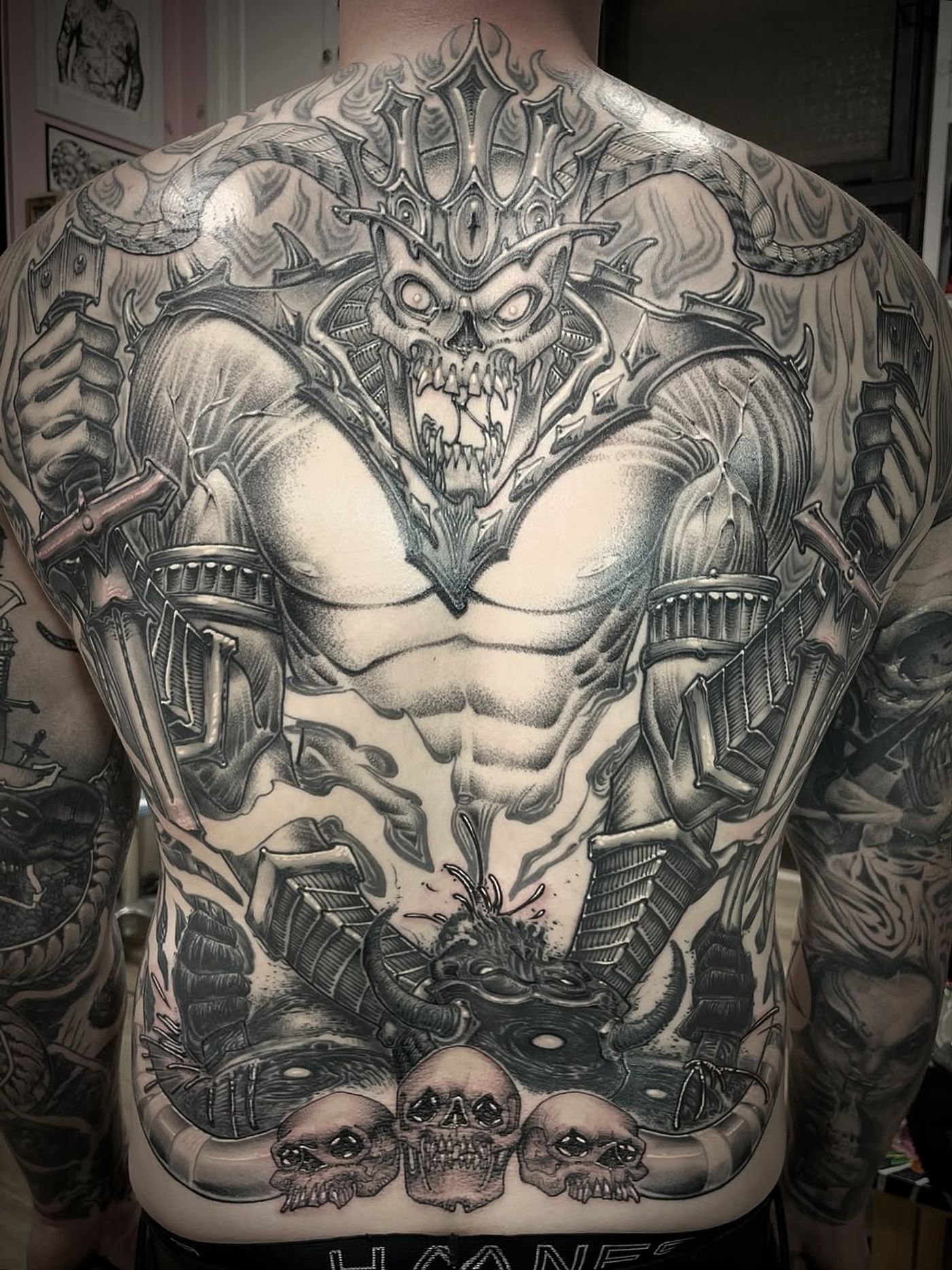 Final session on Jakes back piece @diamondclubtattoo Thank you for the persistence, dedication and above all your trust Jake 🤜🤛 .. we will get some healed pics later To book for a tattoo @diamondclubtattoo and @belmonttattoo DM OR EMAIL P.sandtattoo@gmail.com #elblacoink #solidink #blackclawneedle