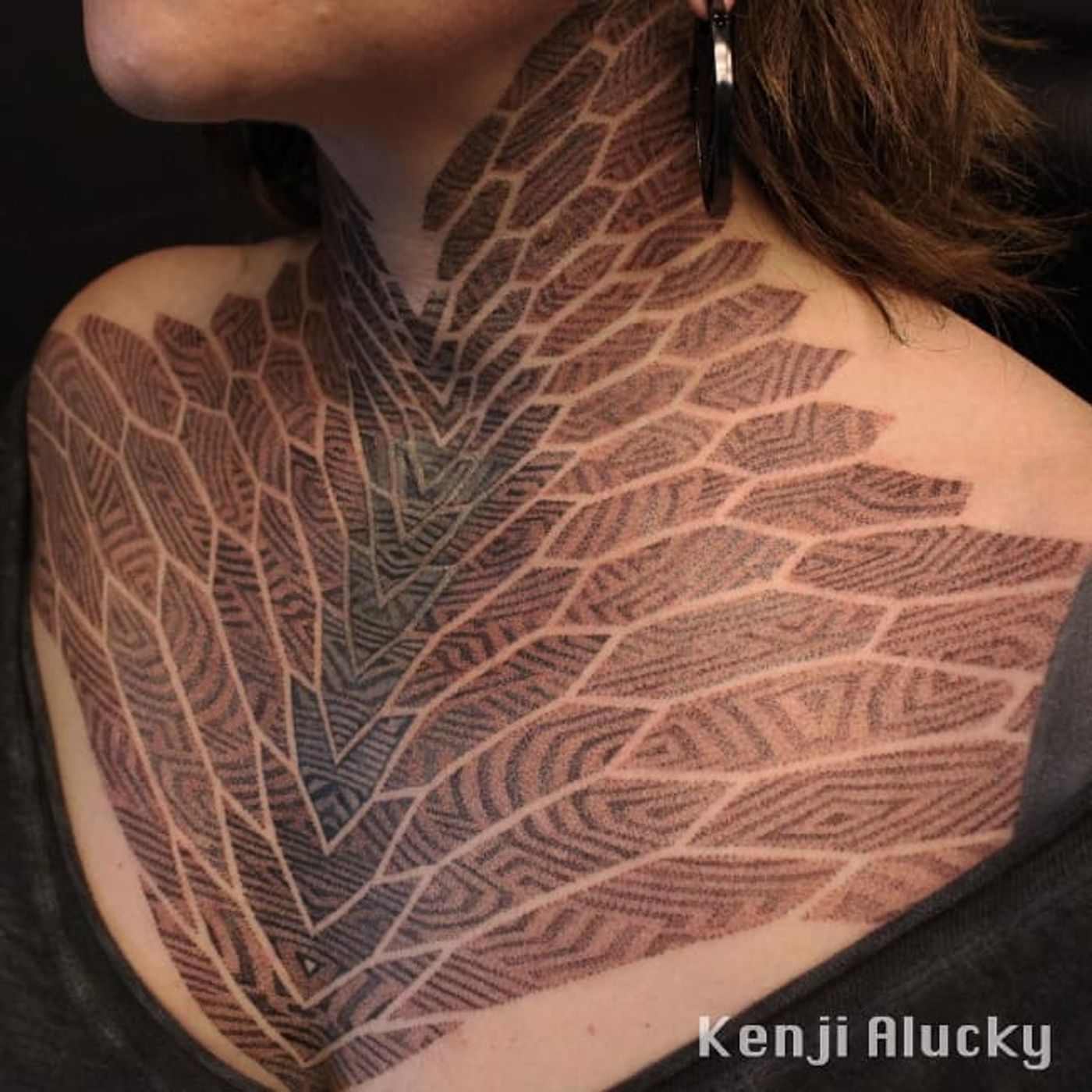 Chest tattoo by Kenji Alucky, photo from Kenji's Instagram @black_ink_power #geometric #blackwork #tribal #patternwork #dotwork