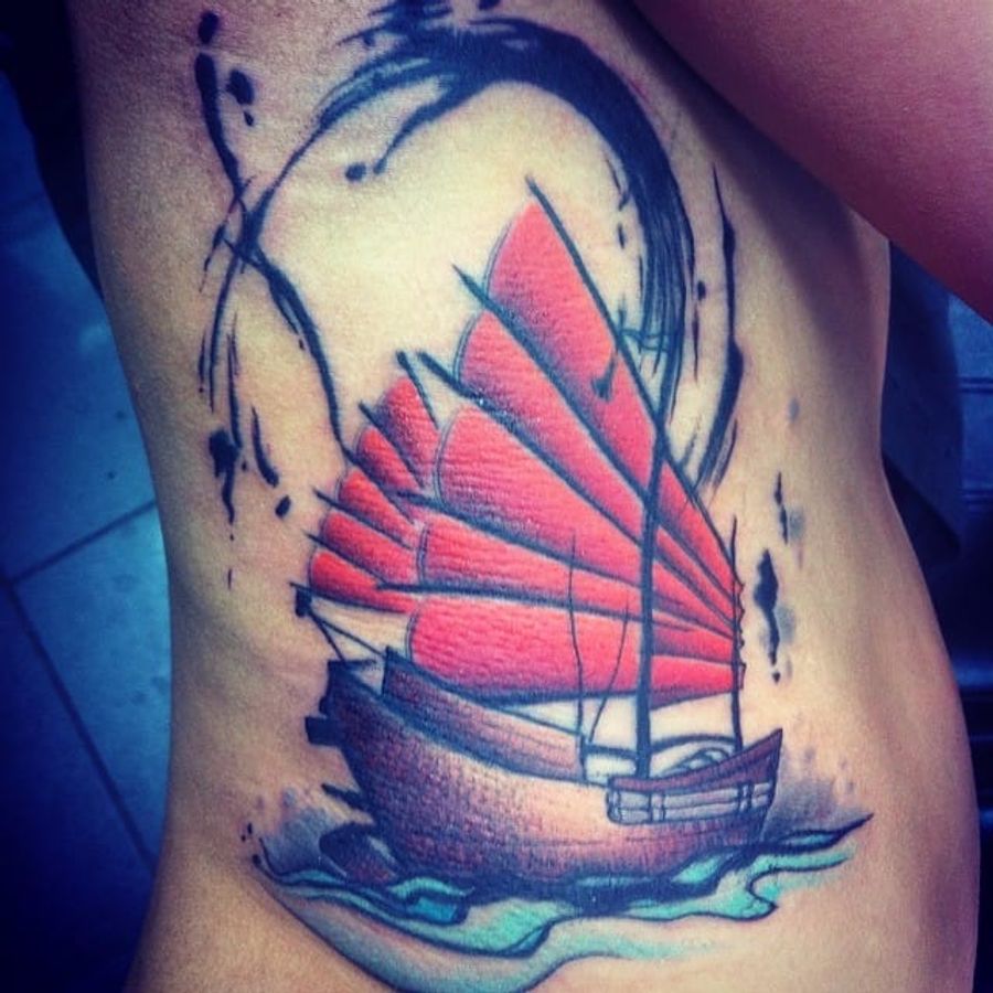 Junk Ship Tattoo by Paul Hallett #junkship #junkboat #junk #asianboat #chineseboat #chineseboats #chinesetattoo #PaulHallett