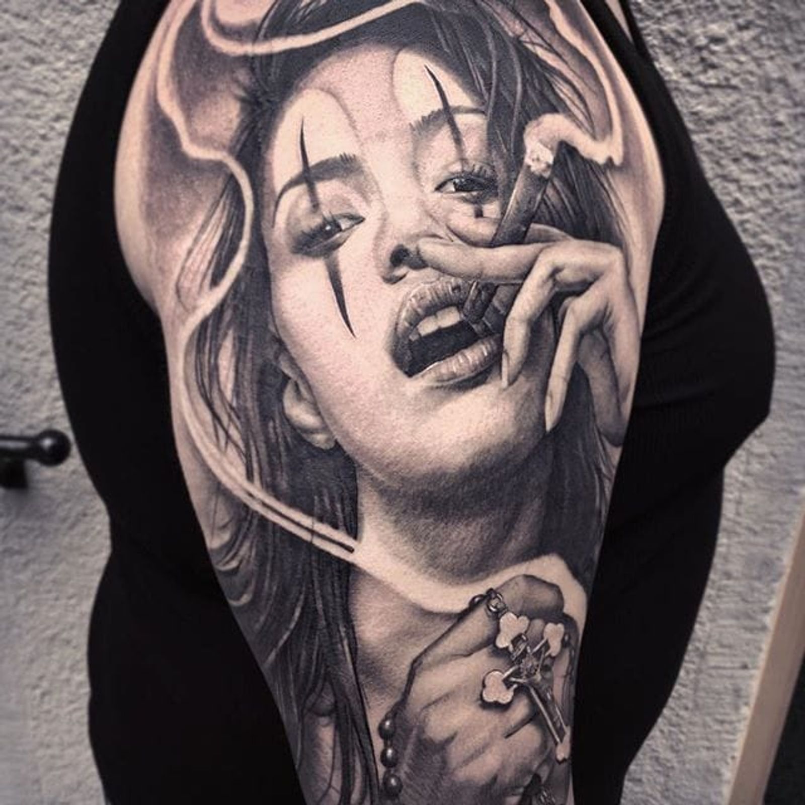 Smoking Girl Tattoo by Andy Blanco #blackandgrey #blackandgreytattoo #blackandgreytattoos #realism #realismtattoo #AndyBlanco #smokinggirl #woman #portrait #smoke #smoking