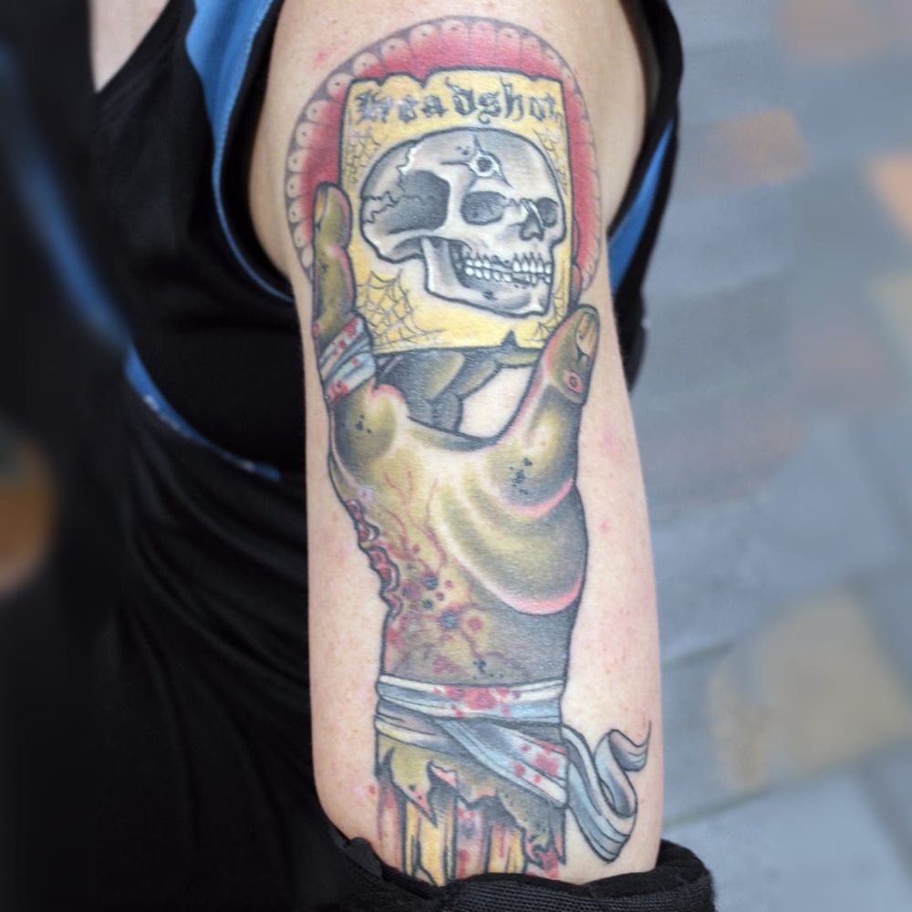 Zombie hand holding Headshot Harlots name card, by @ElliotBowesTattoo from Rough Tattoo in Copenhagen. #zombie #rollerderbytattoo #card #color #roughtattoo #elliotbowes #copenhagen #rollerderby #tattooedathletes