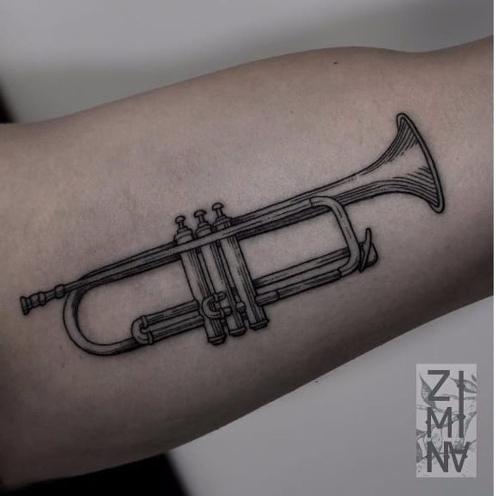 Trumpet tattoo by Zhenya Zimina #ZhenyaZimina #blackwork #engraving #trumpet #btattooing #blckwrk