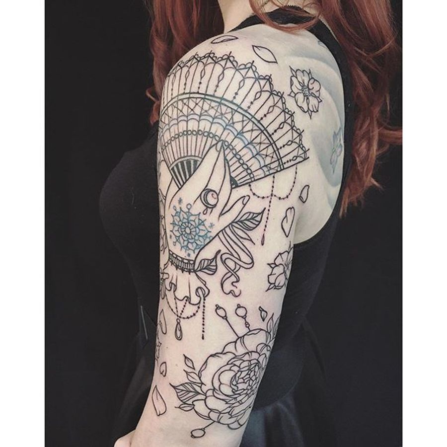 Hand held fan tattoo by Poppy Aanthem #PoppyAanthem #fantattoo #fan #blackwork