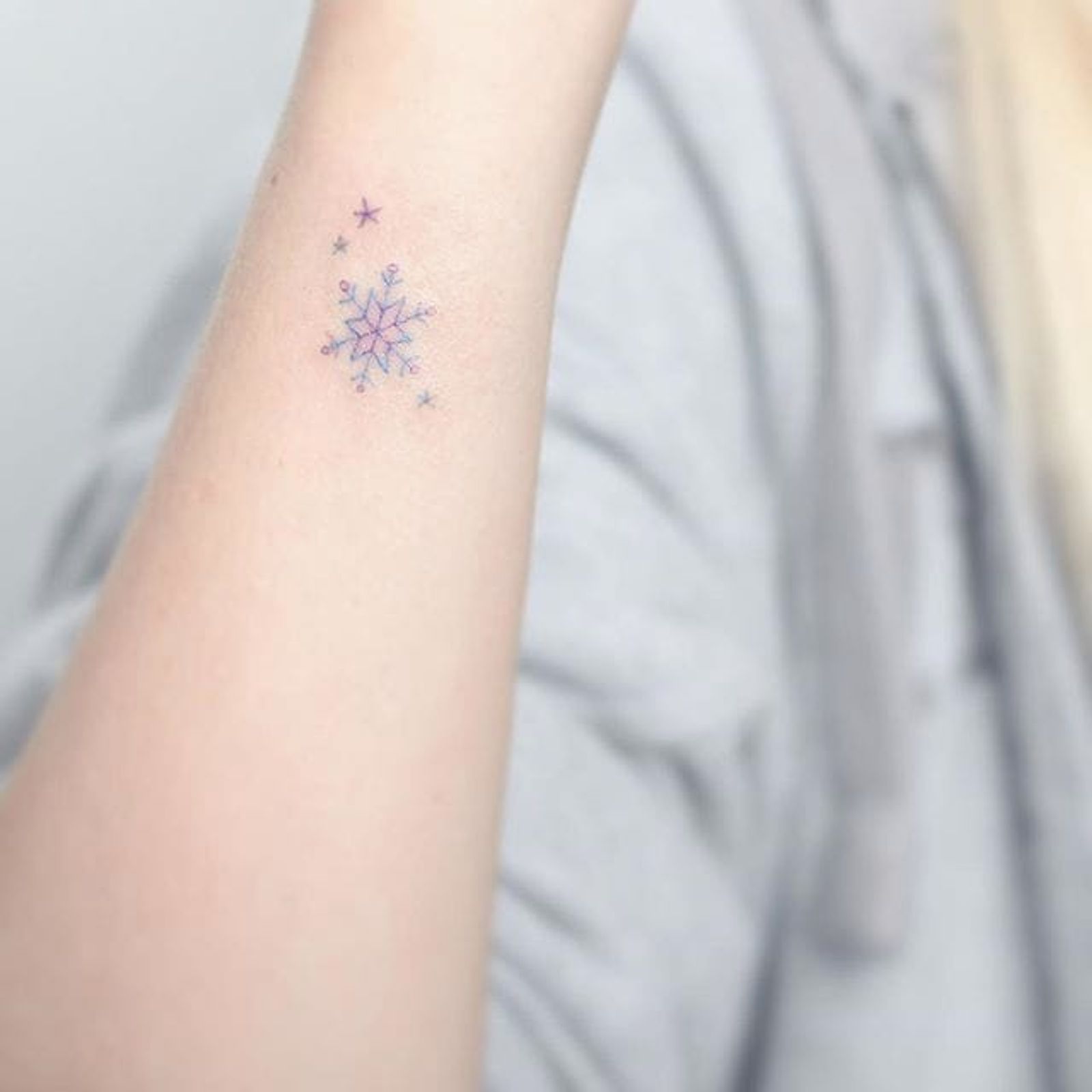 Snowflake tattoo by Mini Lau. #subtle #microtattoo #pastel #southkorean #feminine #girly #tiny #MiniLau #snowflake