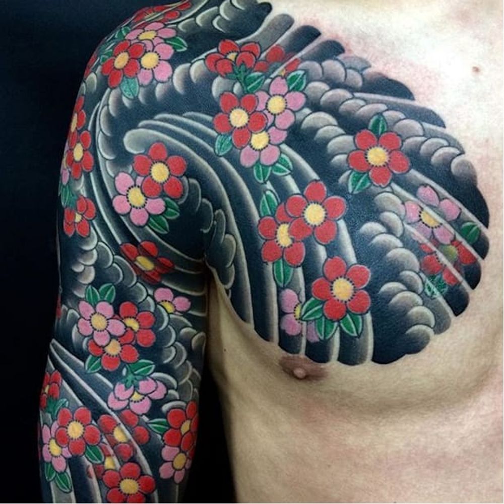 Cherry blossom half-sleeve by Horihide David Chu (IG—horihide_david). #cherryblossoms #dark #HorihideDavidChu #Irezumi #traditional