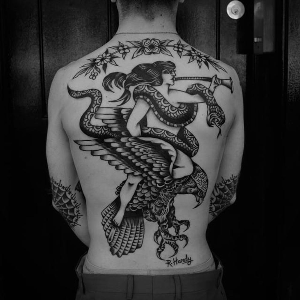 Falcon, Snake and lady with the trumpet, awesome back piece by Rich Hardy. #RichHardy #blackwork #traditionaltattoos #classictattoos #americana #falcon #snake #woman #backpiece