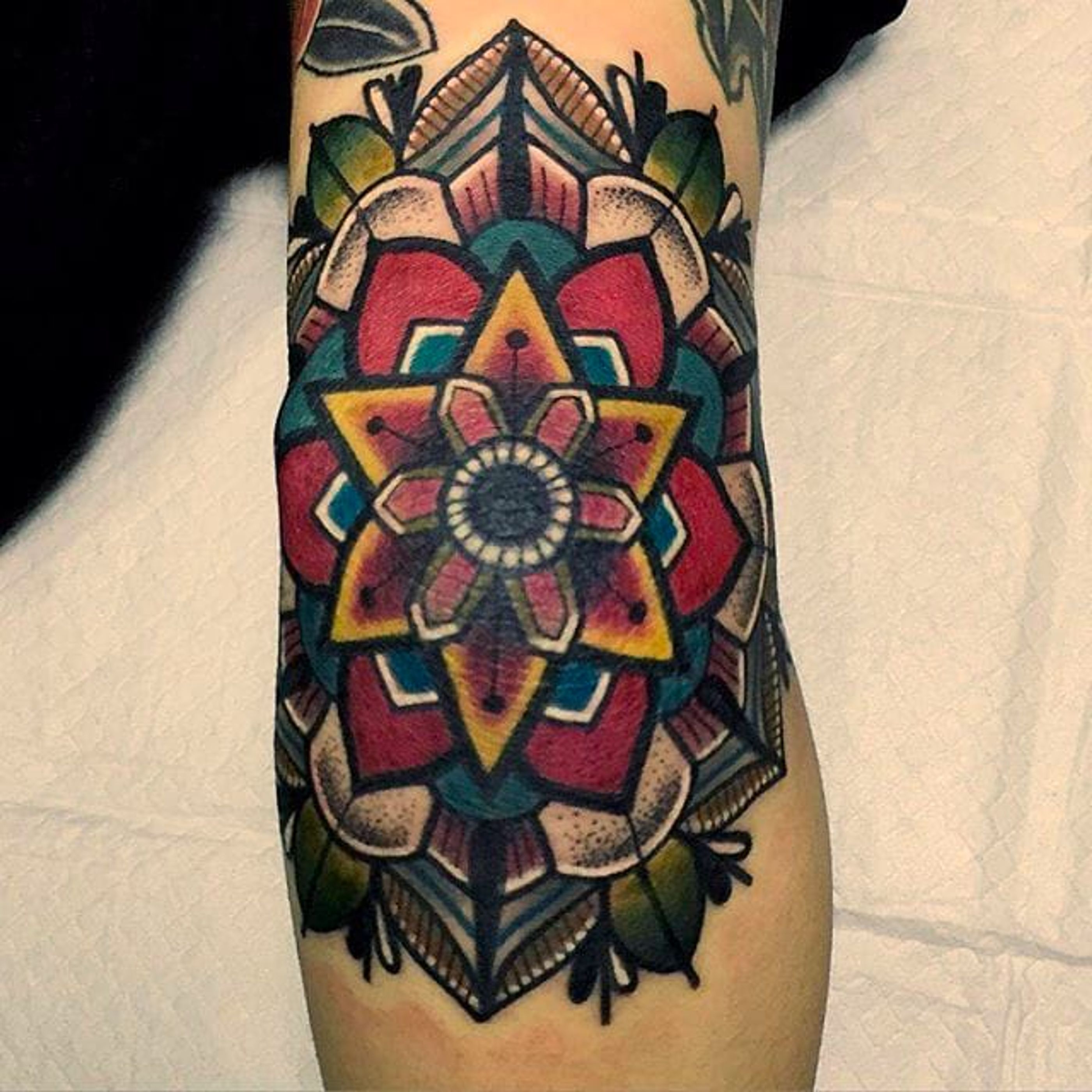 Love the desaturated colors in this mandala tattoo by Mico @Micotattoo #Micotattoo #Mico #mandala #flower #bold