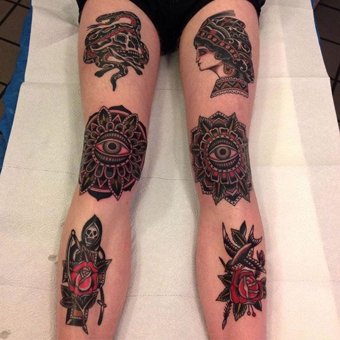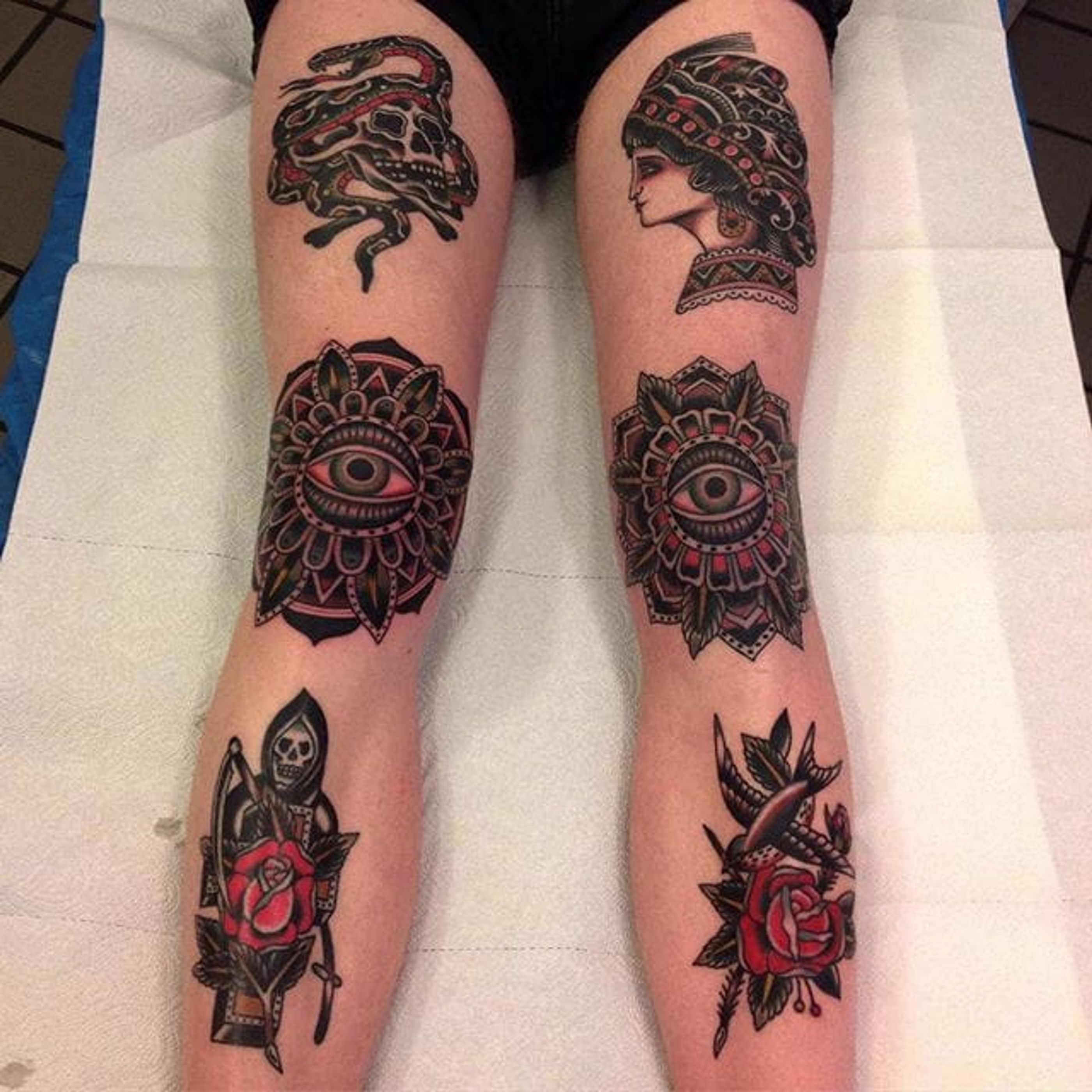 A very nice pair of patchwork sleeves composed of several traditional bangers by Johann Ingemar (IG—sign_of_the_wolf). #bangers #bold #dark #JohannIngemar #ladyhead #mandalas #reaper #skull #snake #sparrow #traditional
