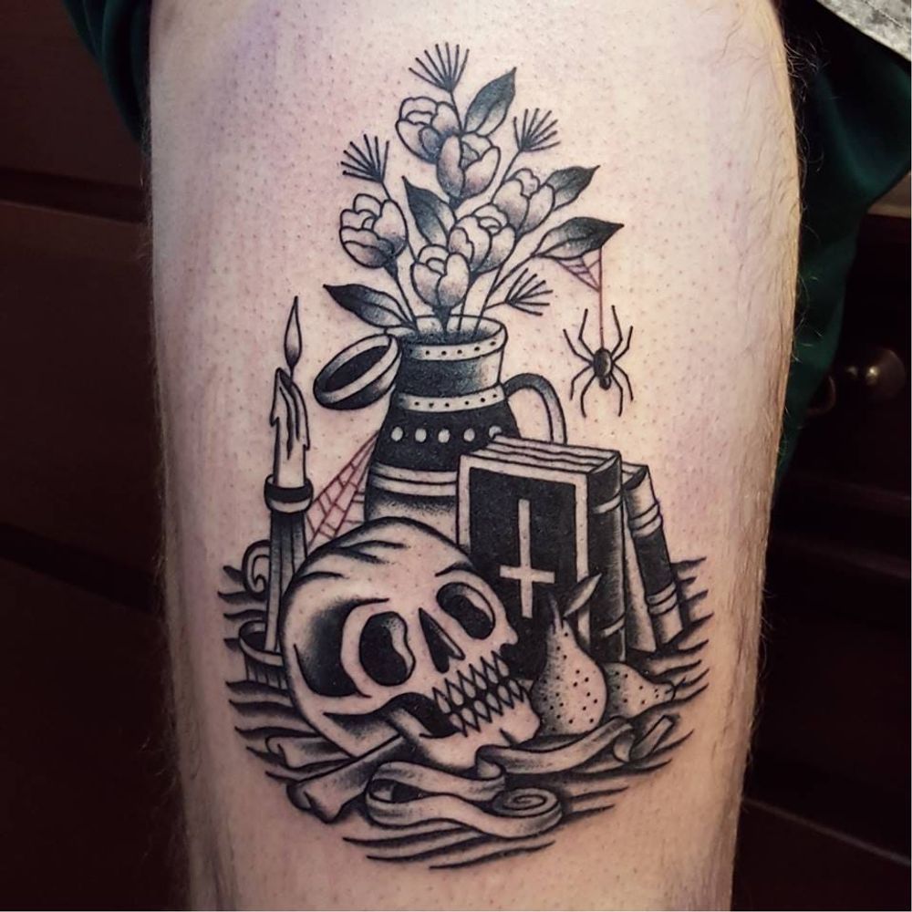 Still life tattoo by Rion #Rion #traditional #stilllife #skull