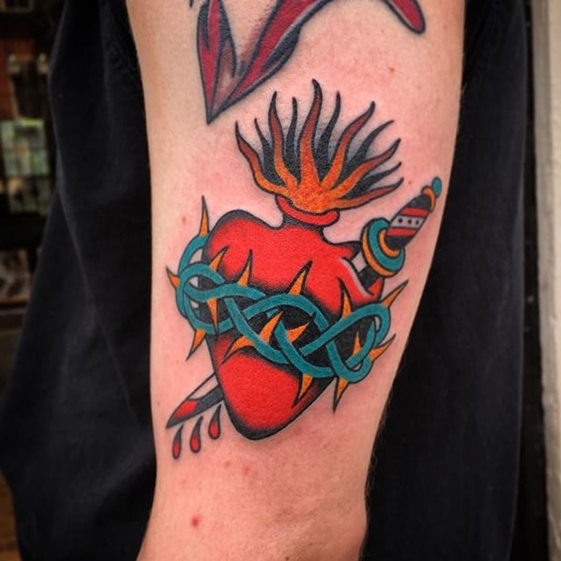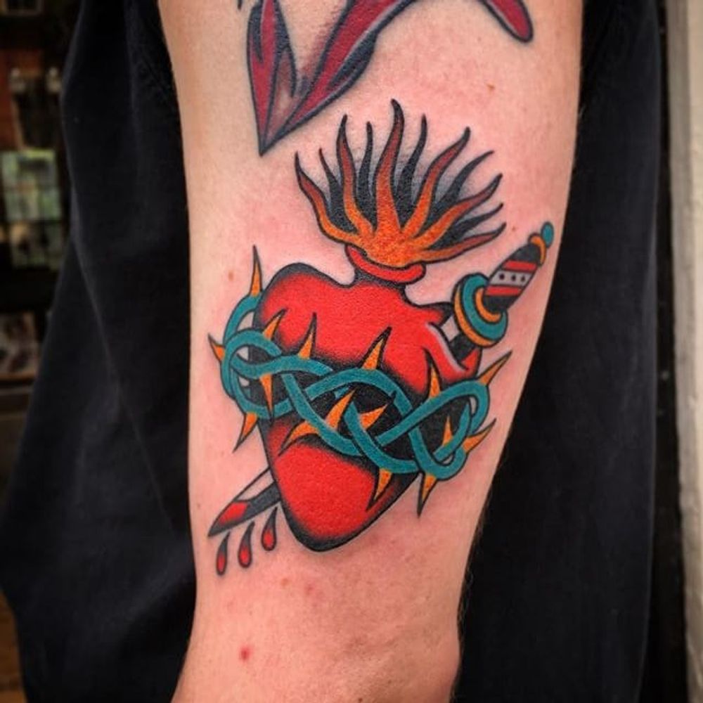 Sacred Heart Tattoo by Dave Halsey #sacredheart #sacredhearttattoo #heart #traditional #traditionalsacredheart #traditionalheart #DaveHalsey