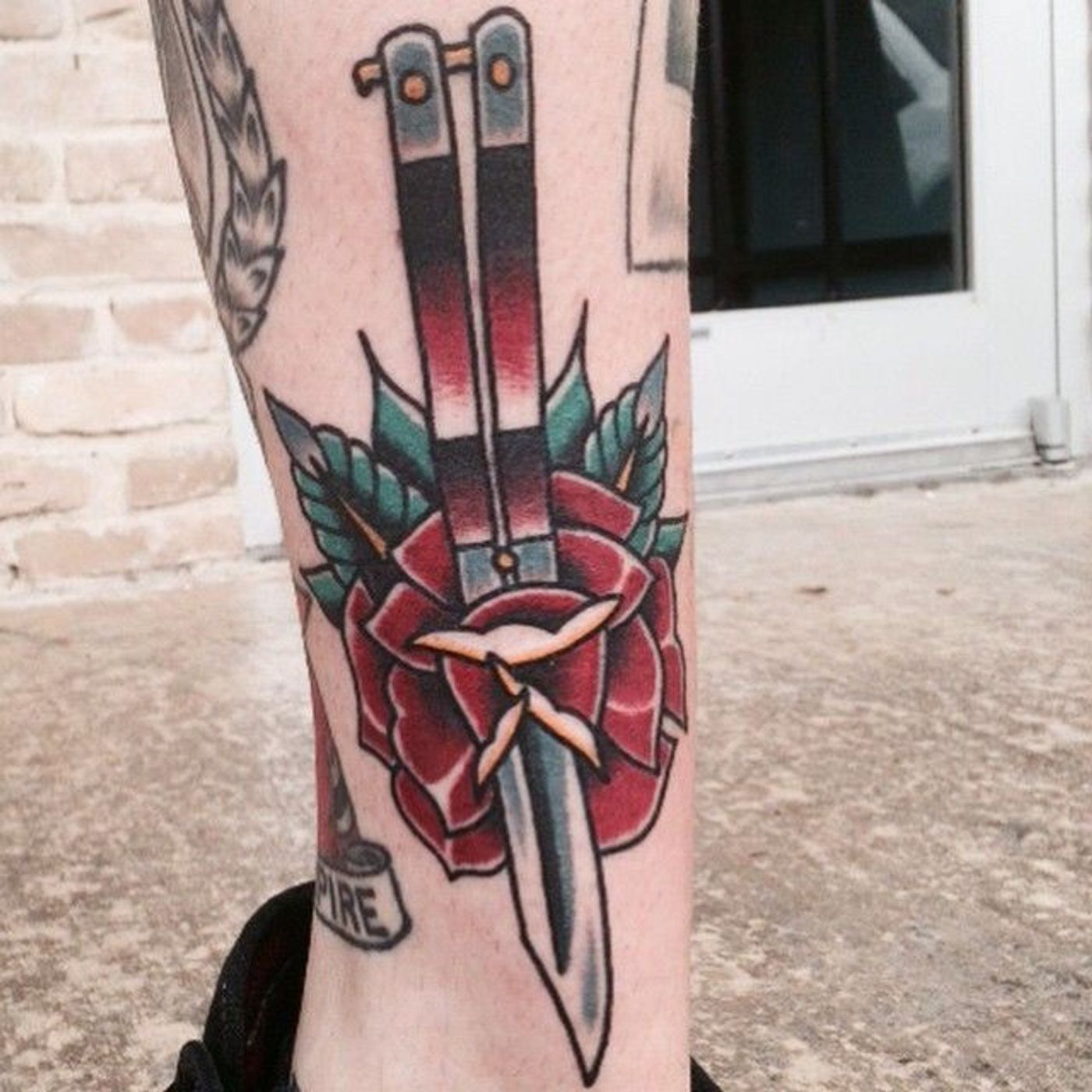 Traditional colour knife, by Jesse Vomhit #JesseVomhit #butterflyknifetattoo