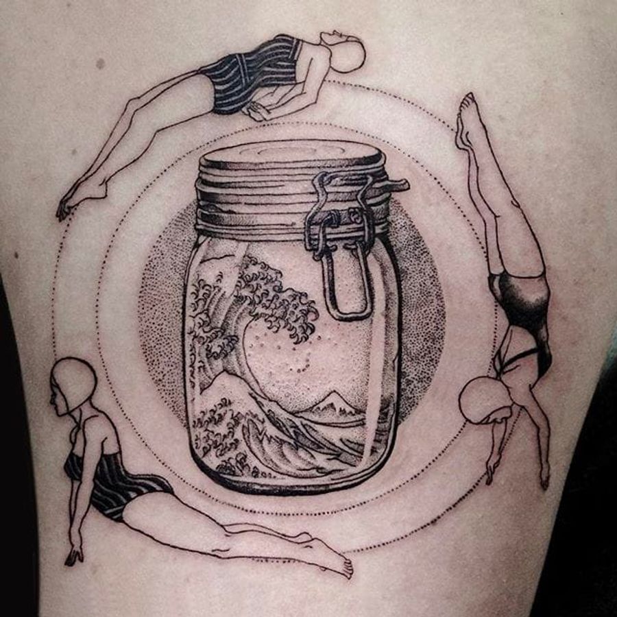 Synchronized swimming Tattoo by Oozy @Oozy_Tattoo #Oozy #OozyTattoo #Blackwork #Black #Linework #OddTattoos #Korea #swimmers #ocean #waves