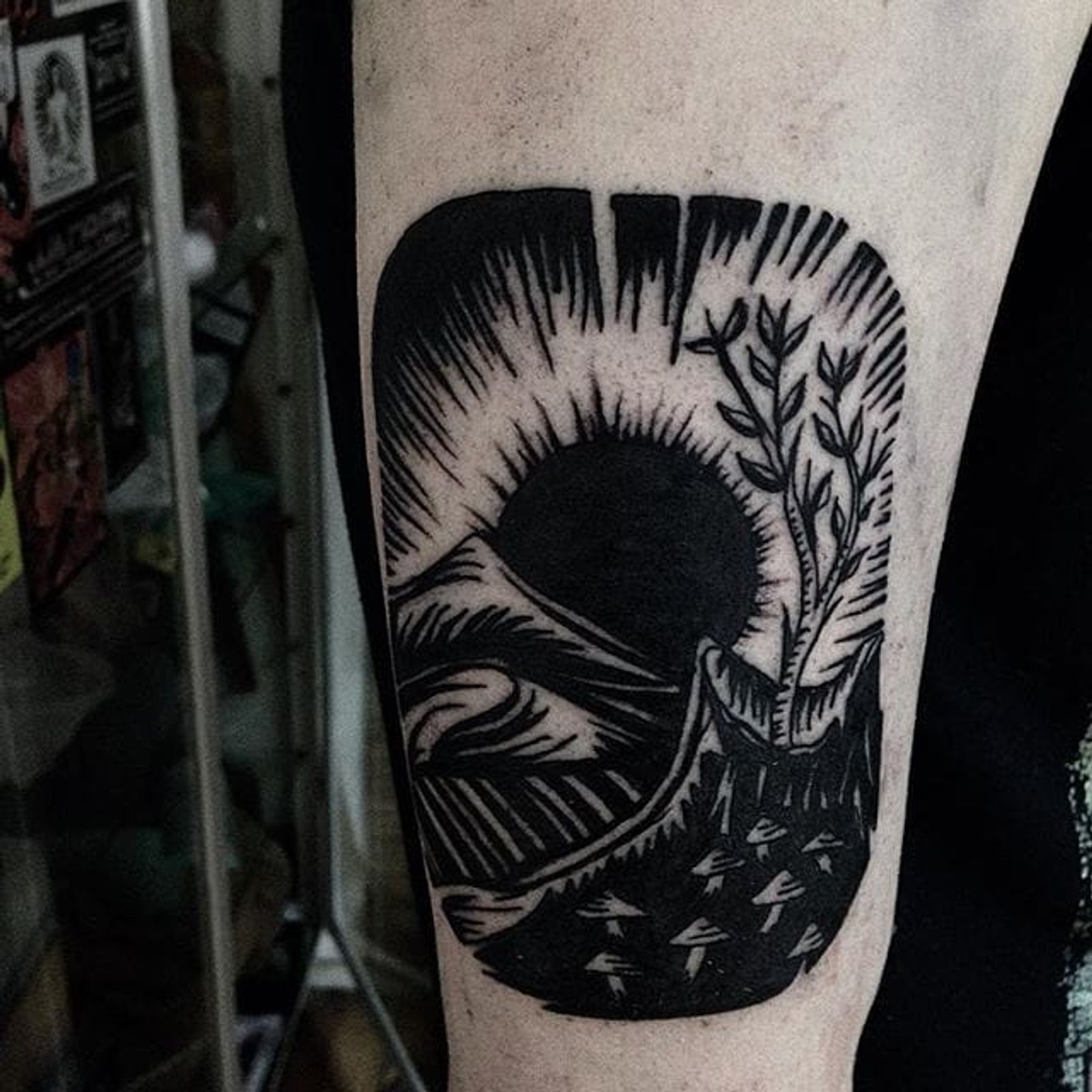 Linocut Landscape Tattoo by Eugene Nedelko #blackwork #blckwrk #linocut #linocutlandscape #landscape #print #mountain #sun #EugeneNedelko