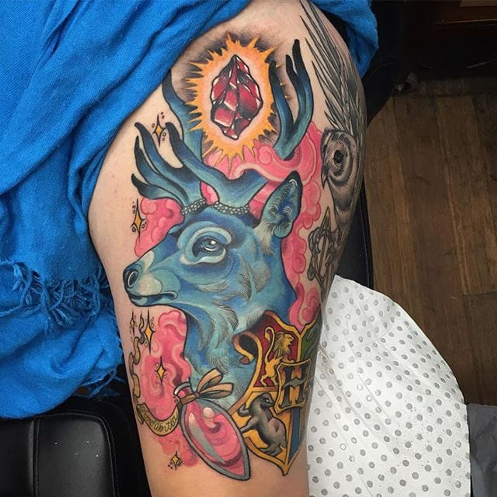 Neo traditional patronus tattoo by Ebony Mellowship. #HarryPotter #patronus #deer #wizard #EbonyMellowship