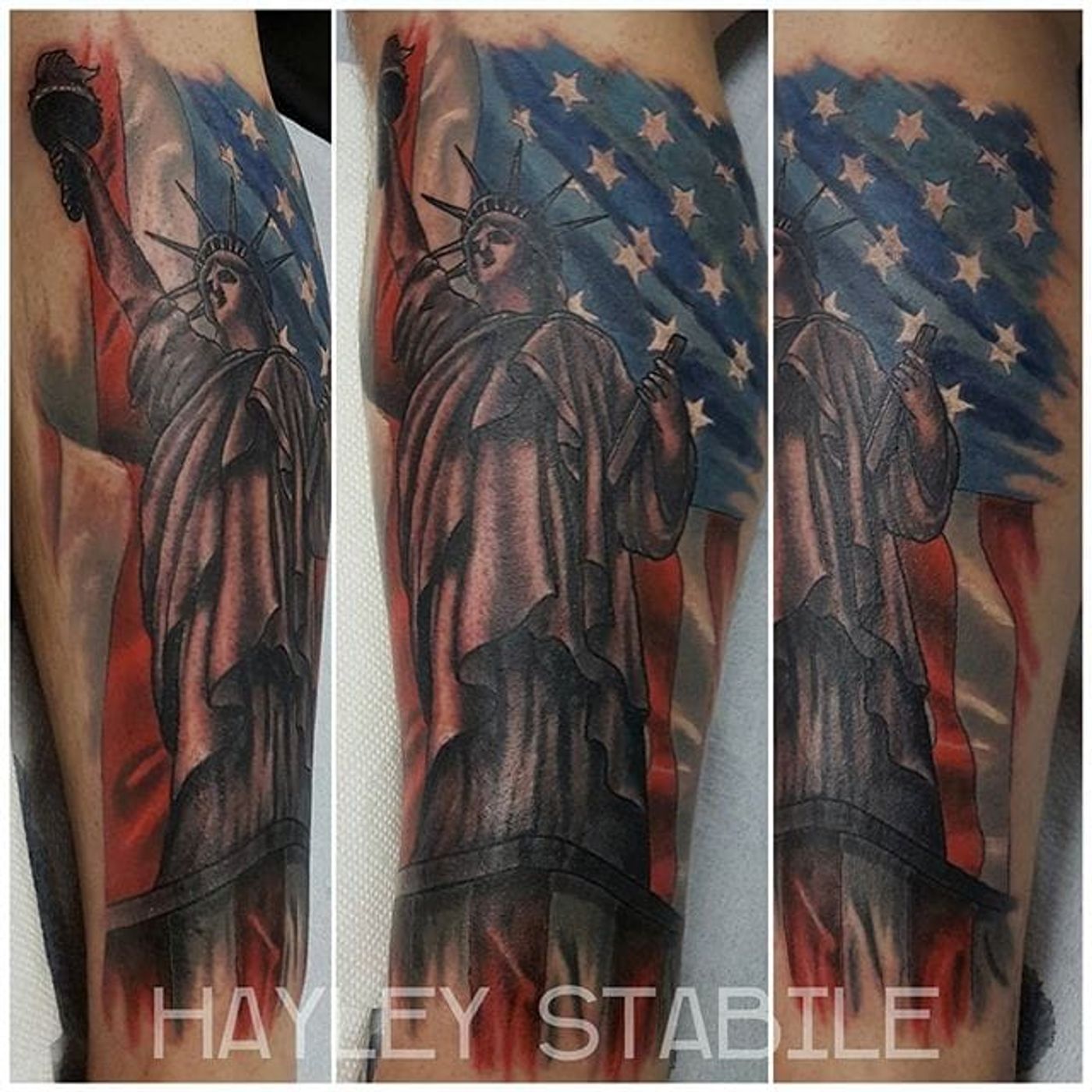 Statue of Liberty and American flag tattoo by Hayley Stabile. #styledrealism #neotraditional #statueofliberty #flag #americanflag #newyork #NY #statue #HayleyStabile