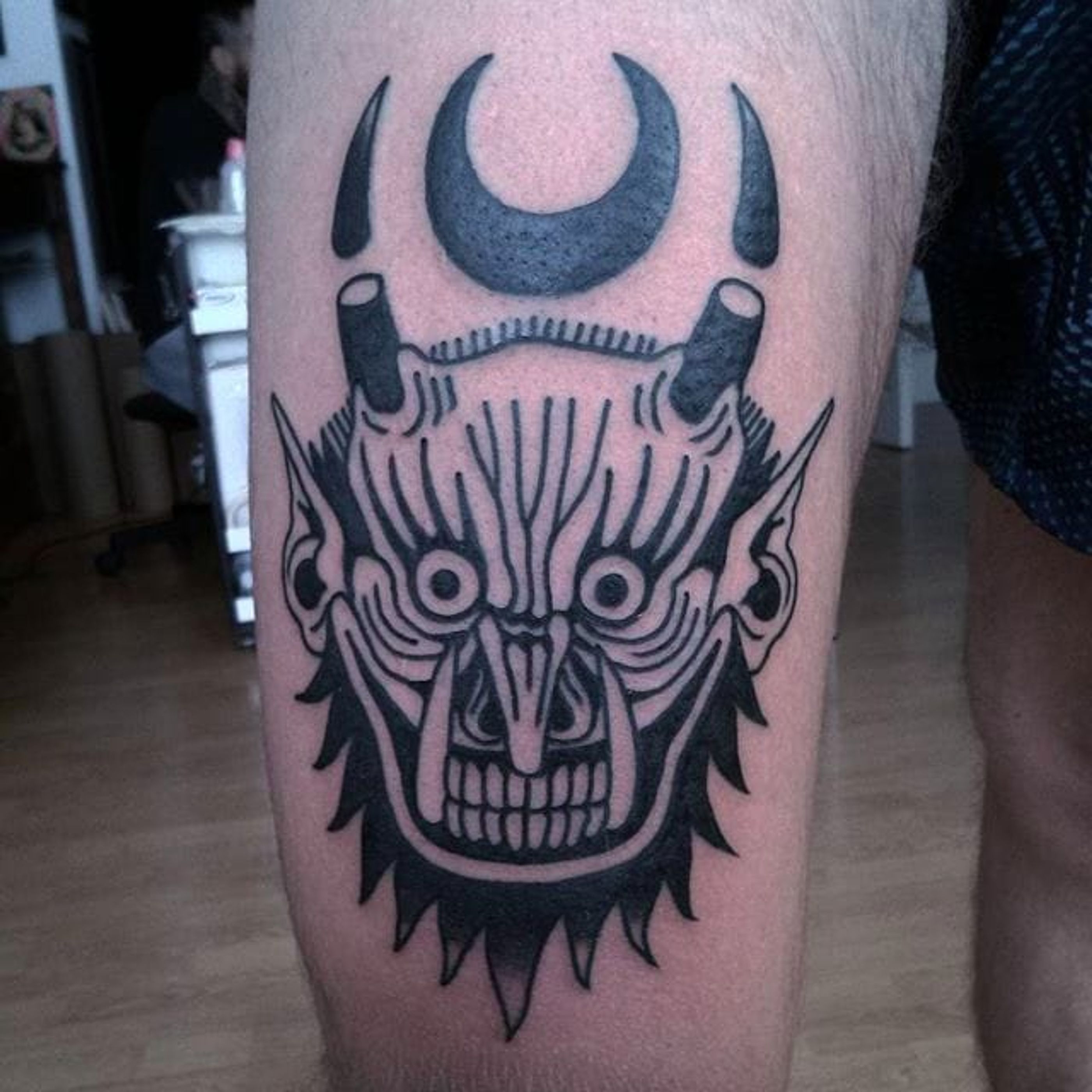 Demon head and crescent, awesome black tattoo by El Carlo. #ElCarlo #ElCarloTattoos #boldtattoos #surreal #demon #demonhead #demon #moon