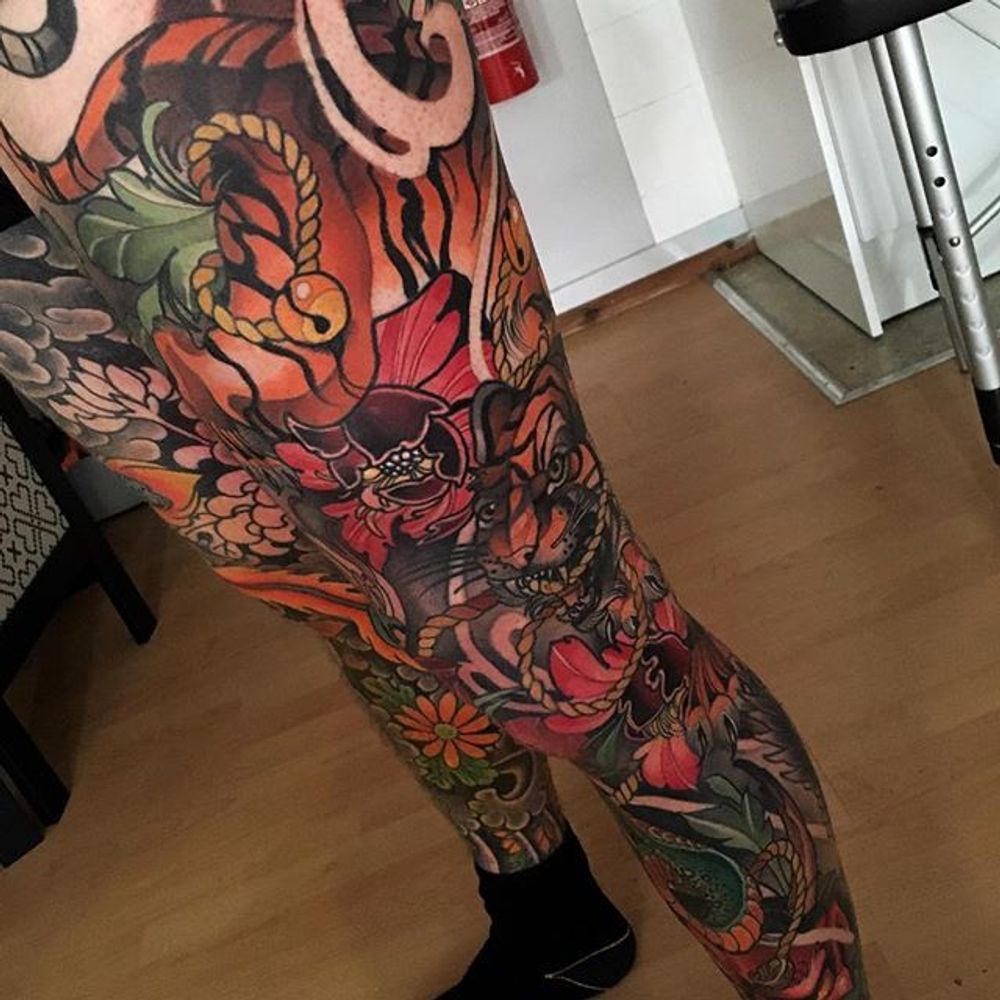 Neo-Traditional Leg Sleeve Tattoo by Joe Frost #neotraditional #nature #flower #tiger #neotraditionalsleeve #sleeve #inspiration #JoeFrost