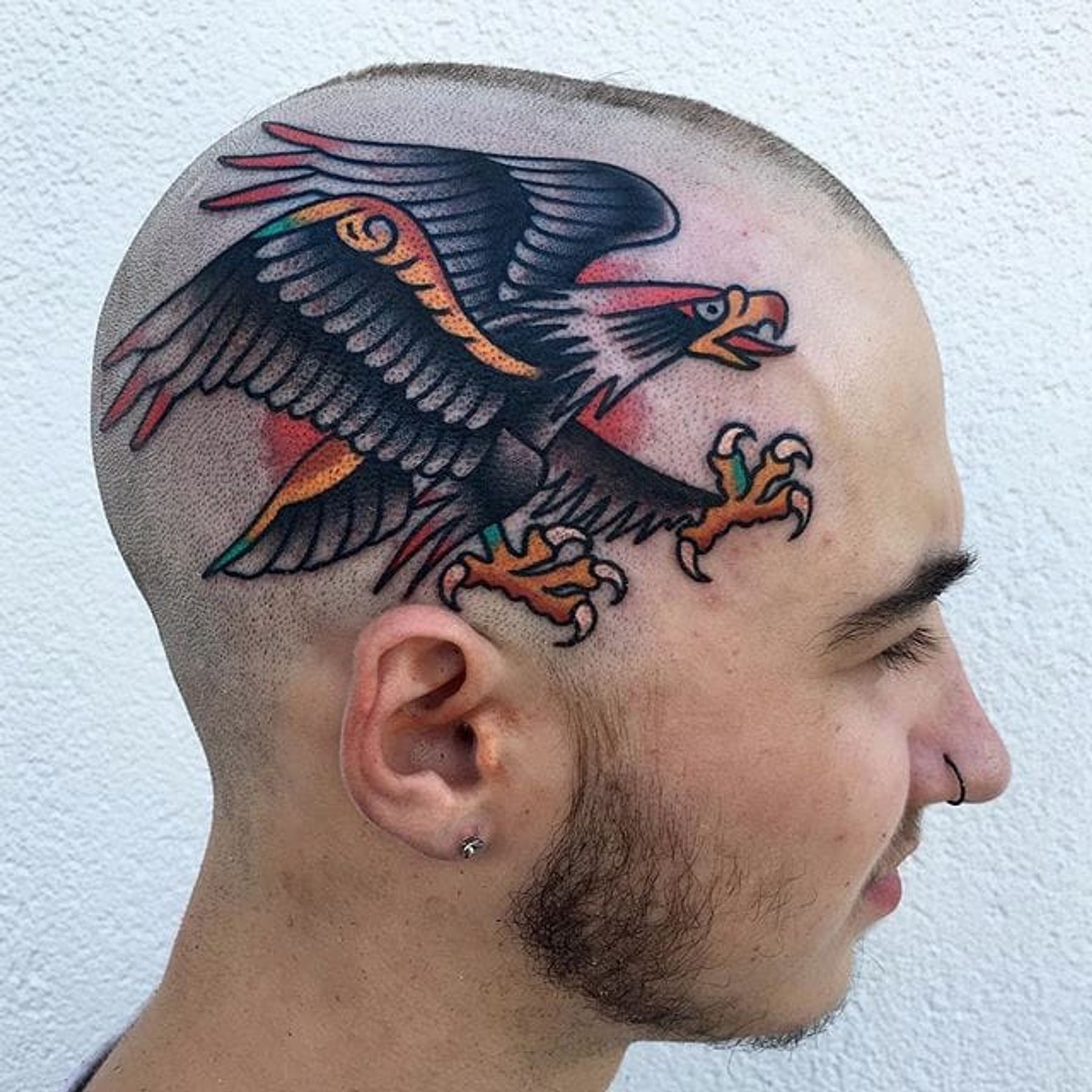 A badass scalp banger of an eagle by Mikey Holmes (IG—mikeyholmestattooing). #bold #colorful #American #eagle #MikeyHolmes #traditional