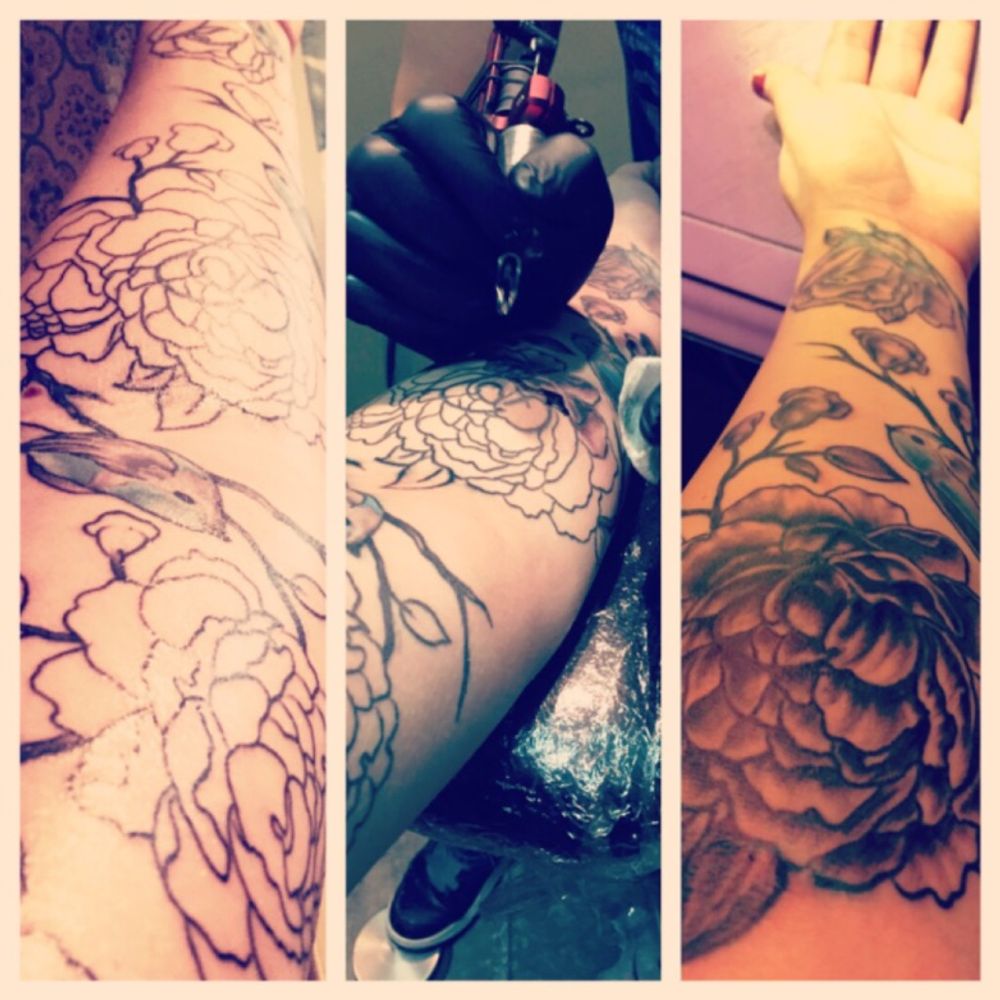 Floral sleeve in the works from Vinny Worden at Slingin Ink