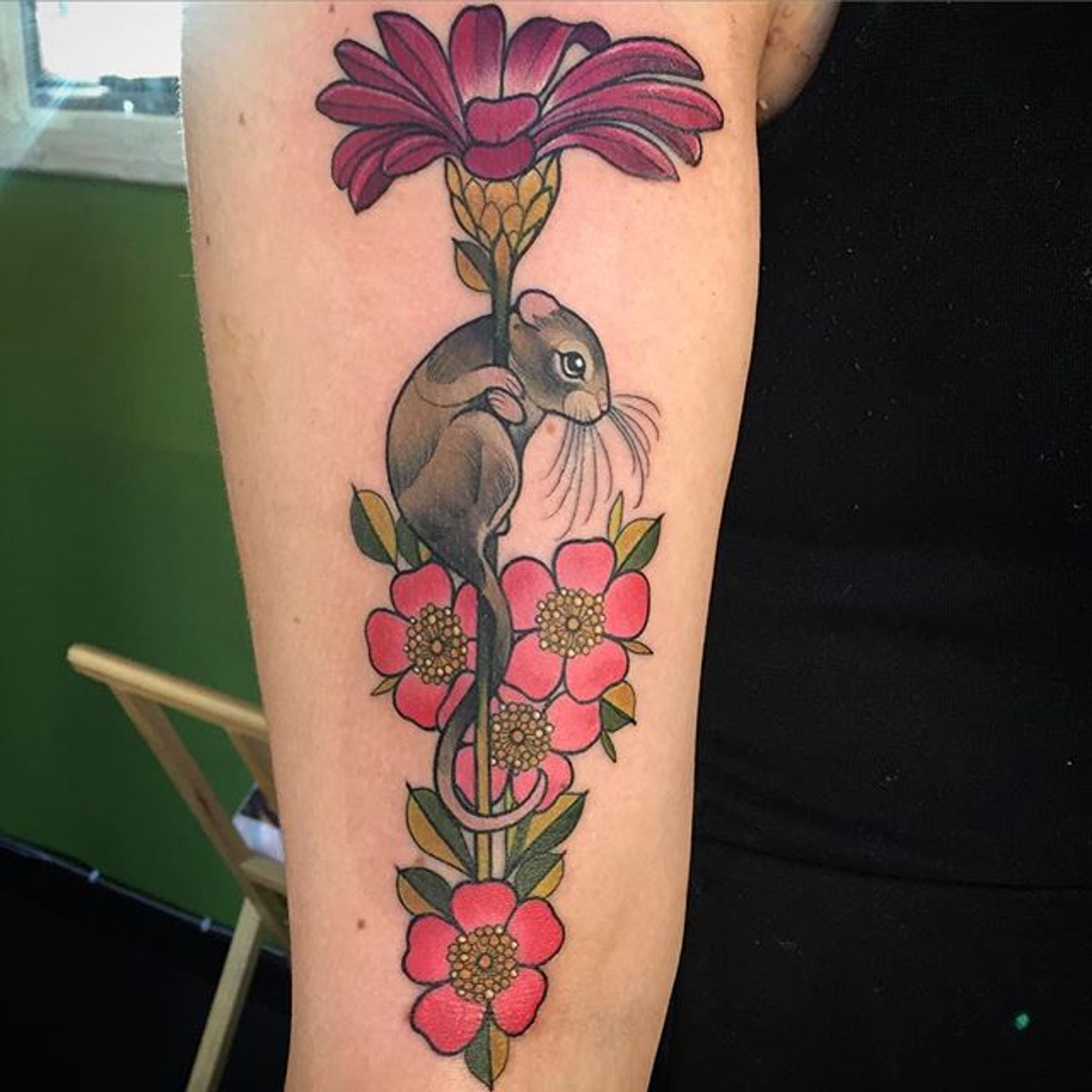 Mouse Tattoo by Charlotte Timmons @charlotte_eleanor88 #color #illustration #neo-traditional #mouse #flowers #charlottetimmons #charlotte_eleanor88